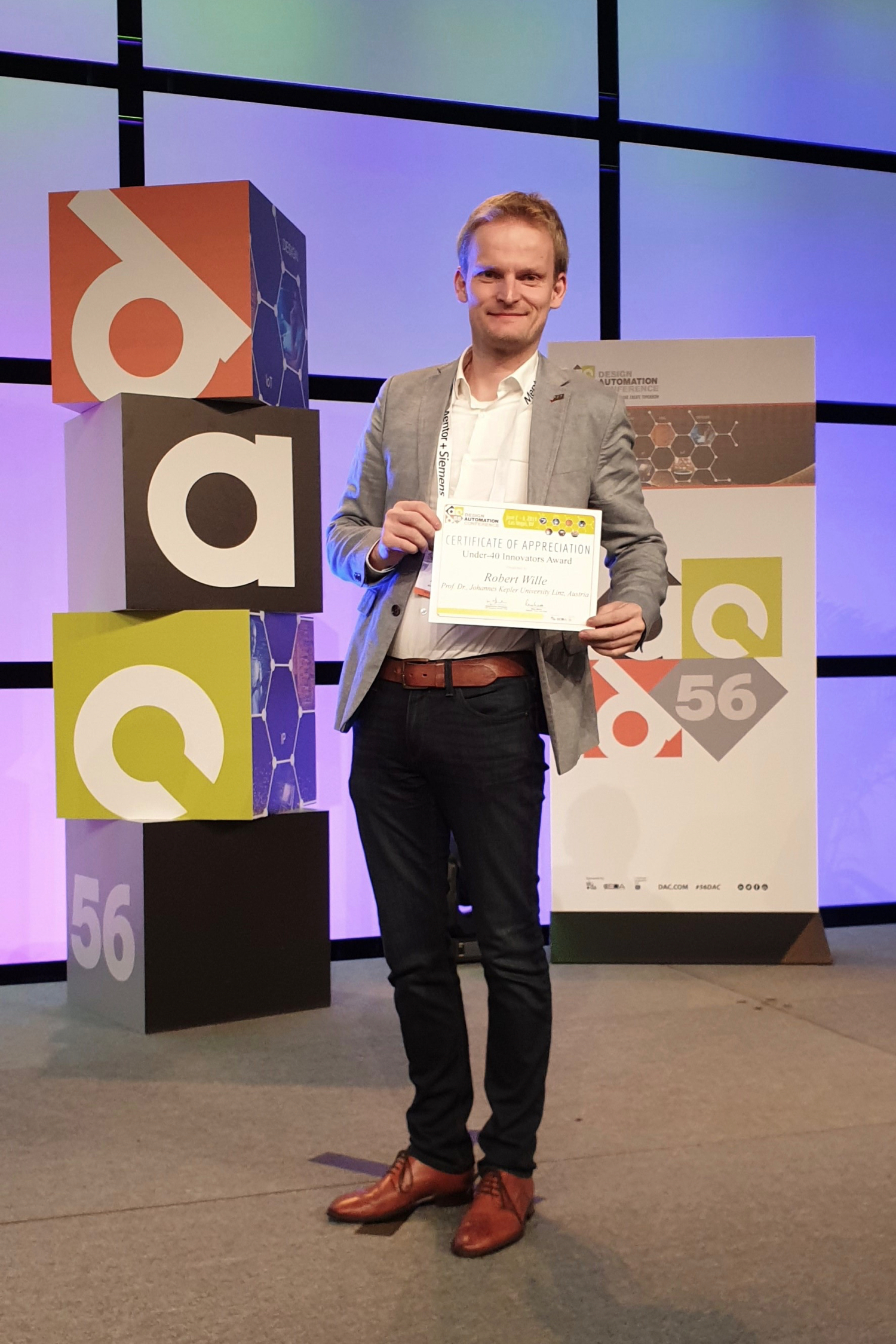 Im Rahmen der Design Automation Conference (DAC) vom 2. bis 6. Juni 2019 in Las Vegas (USA) wurde Prof. Dr. Robert Wille von der Johannes Kepler Universität Linz und dem Forschungsbereich Cyber-Physical Systems des Deutschen Forschungszentrums für Künstliche Intelligenz (DFKI) mit dem „Under-40 Innovators Award“ ausgezeichnet. Der Award wird von der Association for Computing Machinery (ACM) und dem Institute of Electrical and Electronics Engineers (IEEE) an junge Innovatoren verliehen, die sich durch besondere Leistungen auf dem Gebiet des Entwurfs und der Automatisierung von elektronischen Systemen und Schaltungen hervorgetan haben.