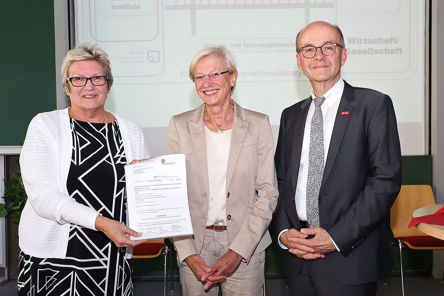 Einen entsprechenden Förderbescheid überreichte Dr. Sabine Johannsen, Staatssekretärin im Niedersächsischen Ministerium für Wissenschaft und Kultur, heute an Ostfalia-Präsidentin Professorin Rosemarie Karger und Professor Ulrich Reimers, Vizepräsident für Hochschulentwicklung und Technologietransfer der TU Braunschweig.