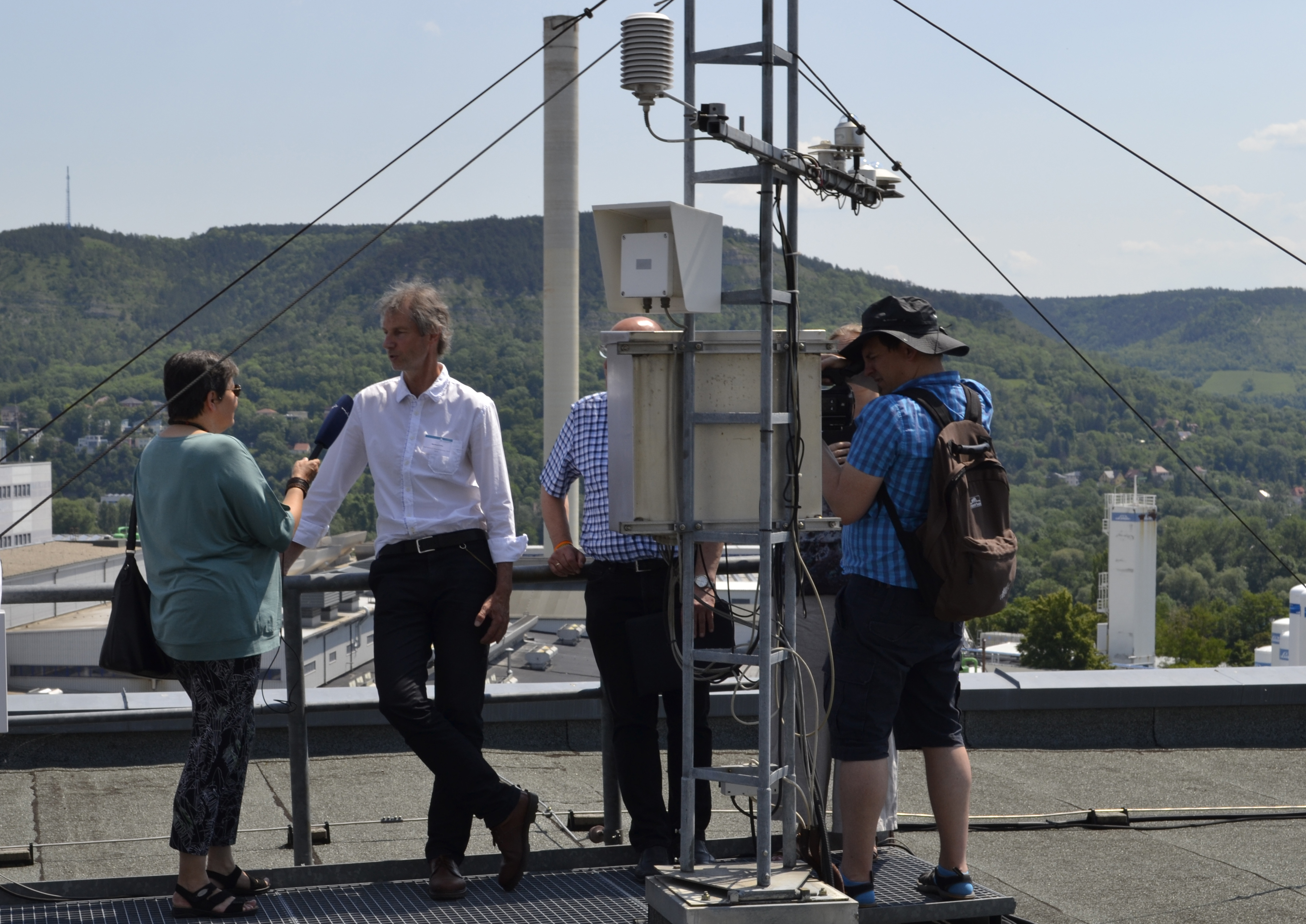 „Forschung für Klima, Umwelt und Nachhaltigkeit“ war das Motto des heutigen Tages. Bereits am Vormittag hatte es zum Anlass eines Jubiläums ein Festkolloquium gegeben: 1999 startete die Klimastation der Hochschule, die bis heute verlässliche Wetter- und Klimadaten liefert. Das Kolloquium fand nicht nur unter dem Dach des Forschungstages, sondern auch auf dem Dach der Hochschule statt, wo die Station live ihre Türen öffnete.