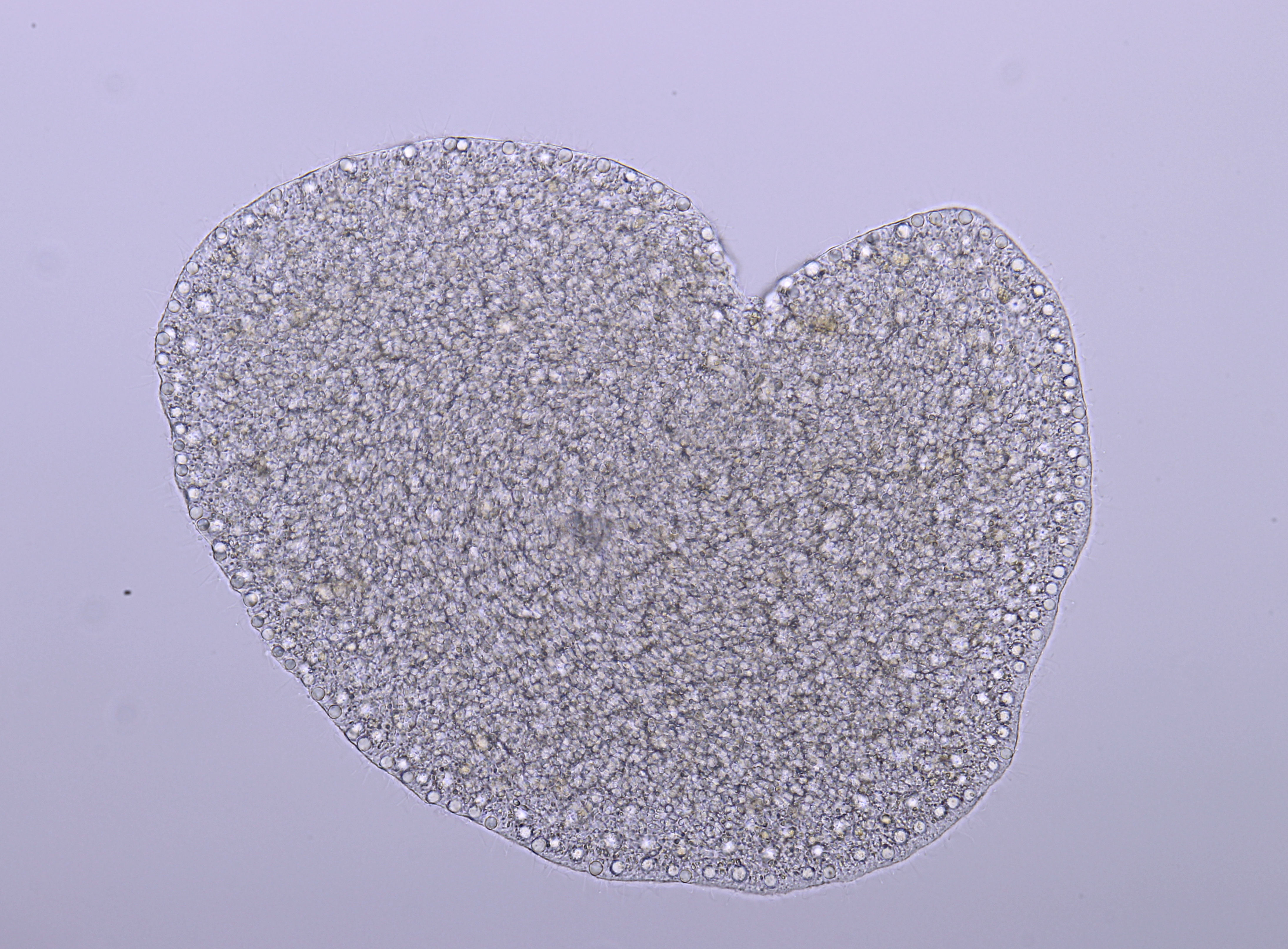 Trichoplax, together with sponges and jellyfish, belongs to one of the most basal lineages of the animal kingdom. Until the 70ies, it was not even clear if Trichoplax is a proper, fully-grown animal or just the juvenile stage of a jellyfish. Only about a half a millimetre in diameter, these animals lack a mouth, gut and any other organs, and are made up of only six different kinds of cells. Its simplicity makes it a popular model organism for biologists.