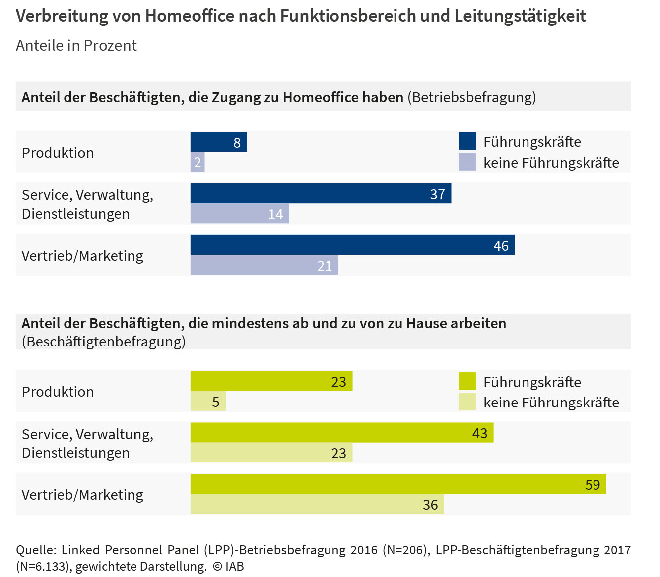 26 Prozent aller Betriebe bieten zumindest einem Teil ihrer Beschäftigten die Möglichkeit, mobil zu arbeiten, also von zu Hause aus oder von unterwegs. Zwölf Prozent der Beschäftigten nutzen dies. Detaillierte Aussagen können auf Grundlage der Betriebs- und Beschäftigtenbefragung „Linked Personnel Panel (LPP)“ für privatwirtschaftliche Betriebe mit mindestens 50 Mitarbeitern getroffen werden. Hier beträgt der Anteil der Betriebe, die Arbeiten von zu Hause aus möglich machen, 37 Prozent. Ein regelmäßiges Homeoffice von mindestens einem Tag in der Woche ermöglichen 16 Prozent der privatwirtschaftlichen Betriebe mit mindestens 50 Mitarbeitern.