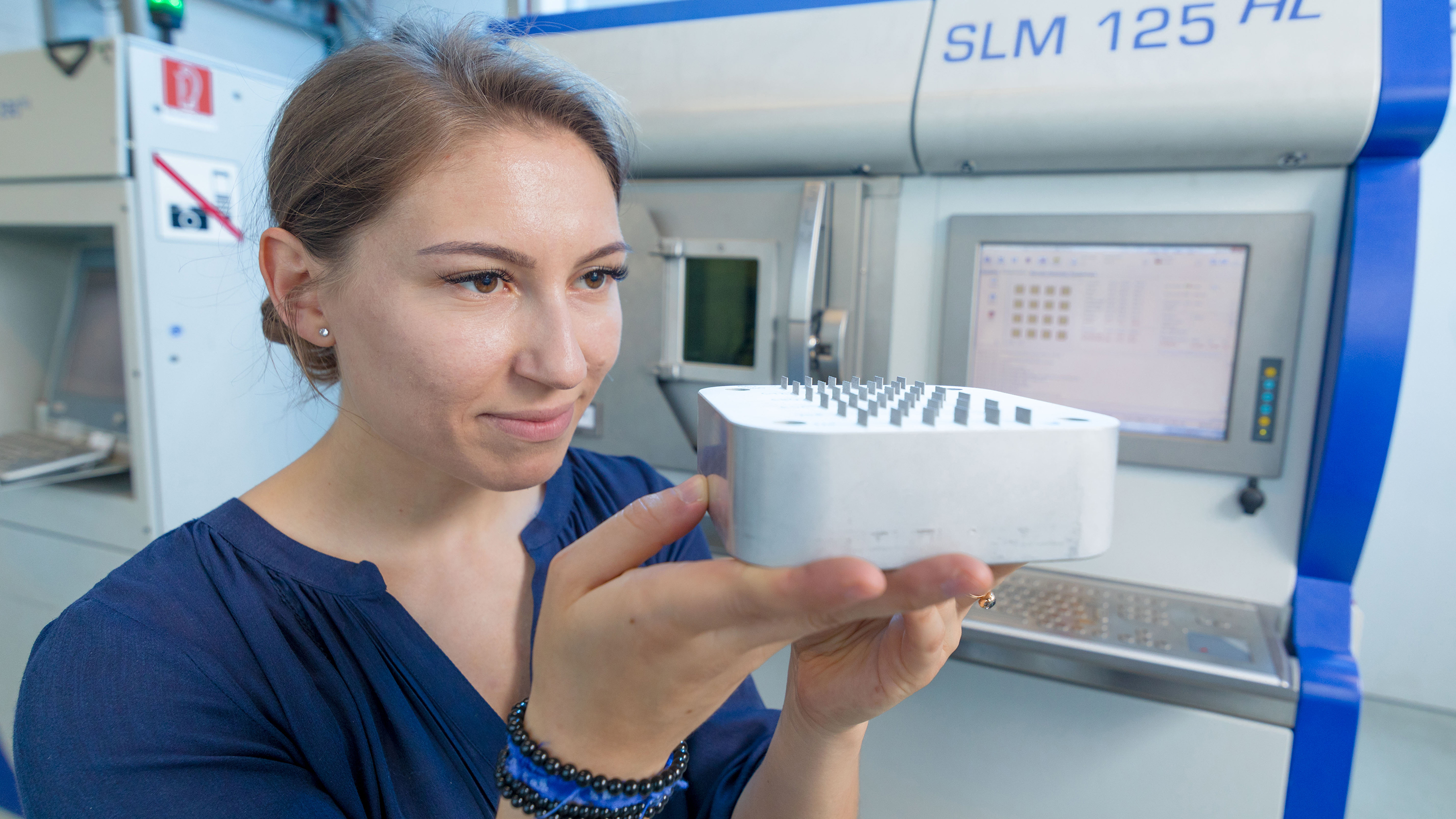 Ist das Bauteil gefertigt, wird es zunächst von überschüssigem Pulvermaterial befreit und von der Plattform getrennt. Schließlich werden die Stützstrukturen wieder entfernt. Das nicht benötigte Pulver wird zu mehr als 90 Prozent wiederverwendet, lediglich das sogenannte Überkorn, also Schweißspritzer, müssen durch Heraussieben entfernt werden. „Dieser Aspekt trägt entscheidend zur Ressourceneffizient des Verfahrens bei“, schätzt Winkler ein. „Die gefertigten Bauteile werden anschließend unterschiedlichen Nacharbeitsschritten unterzogen. Darunter fallen je nach Einsatzszenario beispielsweise Wärme- und Oberflächenbehandlungen sowie kleinere zerspanende Arbeiten“, so die Forscherin. In künftigen Untersuchungen wollen sich die Mitarbeiterinnen und Mitarbeiter auf die Reduktion der Stützstrukturen, den Halt des Bauteils und dessen Oberflächenbeschaffenheit fokussieren.