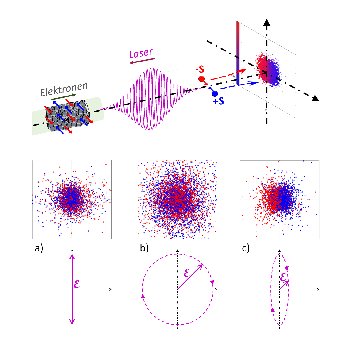 Zugrunde liegt dabei die so genannte Strahlungsrückwirkung. Die Elektronen werden im Laserfeld von dessen elektrischer und magnetischer Kraft hin- und hergetrieben und diese Bewegung führt wiederum zur Abstrahlung von Lichtquanten, die zudem von der Spinrichtung abhängt. Hierbei erfährt das Elektron einen kleinen Rückstoß, was seine Bewegungsrichtung ändert. Für rein lineare (a) oder zirkulare Polarisation (b) des Lasers geschieht dies aber in gleicher Weise für alle möglichen Richtungen, welche die oszillierenden Felder annehmen können, so dass am Ende Elektronen einer bestimmten Spinrichtung eine Ablenkung sowohl nach links wie nach rechts erfahren. Für leicht elliptische Polarisation ist aber diese Symmetrie aufgehoben und ergibt den gewünschten Effekt der Spintrennung. In den Rechnungen ergab sich ein Polarisationsgrad von bis zu 70%.