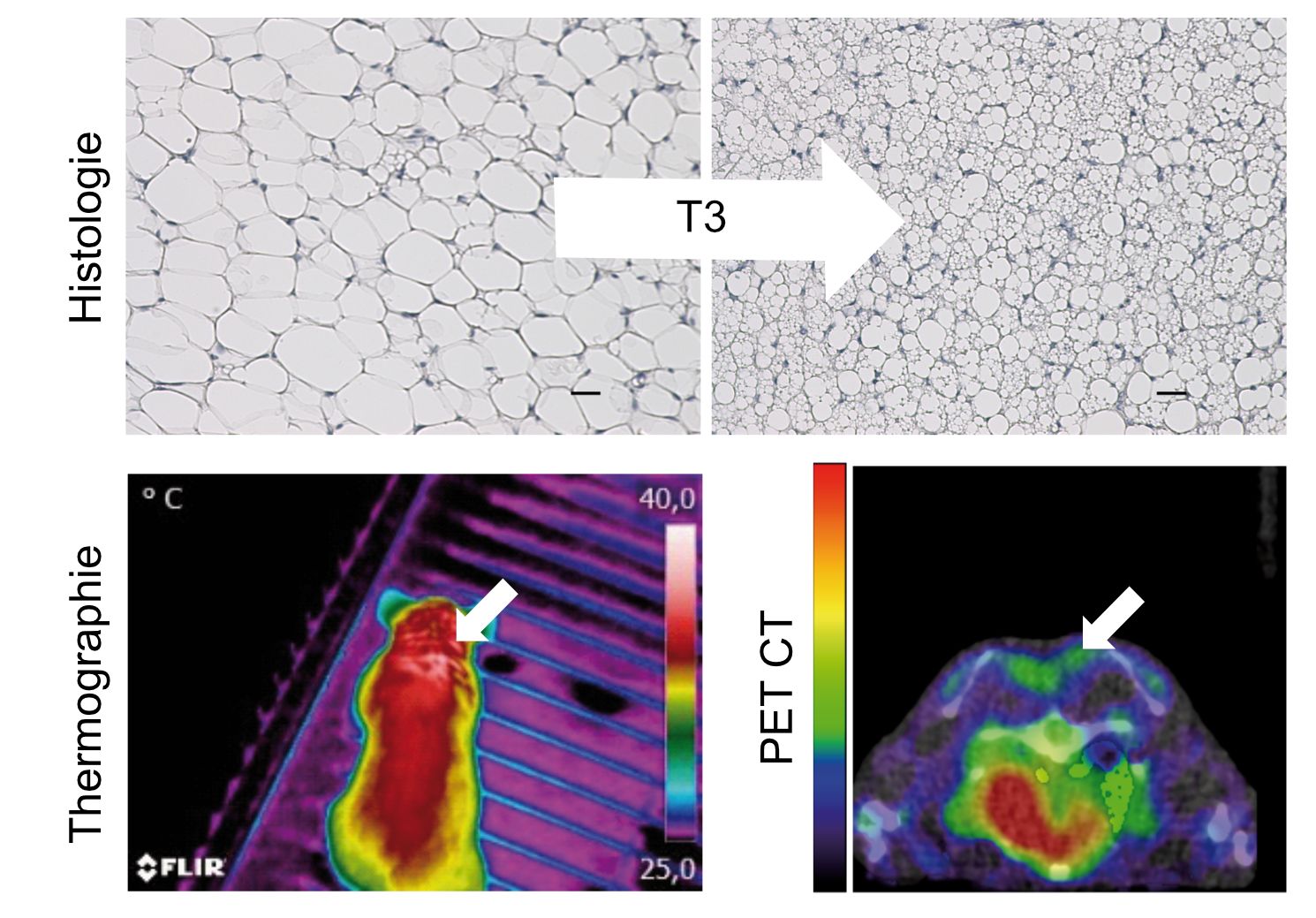 “Die erhöhte Körpertemperatur in der Hyperthyreose ist eine Kombination von mehreren Wirkungen der Schilddrüsenhormone. Im Muskel erhöhen sie den Grundumsatz, wodurch mehr Wärme produziert wird. Zeitgleich wirken sie im Gehirn, wo sie den zentralen Stellwert für die Körpertemperatur erhöhen, ähnlich wie bei Fieber”, erläutert Prof. Dr. Jens Mittag, Leiter der Studie. “Unsere Studien haben darüber hinaus gezeigt, dass Schilddrüsenhormone die Entstehung von braunem oder beigem Fett begünstigen – ein Gewebe, das therapeutisch interessant ist, weil es überschüssiges Fett in Wärme umwandeln kann”, ergänzt Kornelia Johann, Erstautorin der Publikation. “Allerdings war dieses Gewebe nicht aktiv und trug nicht zu den Symptomen der Hyperthyreose bei.”