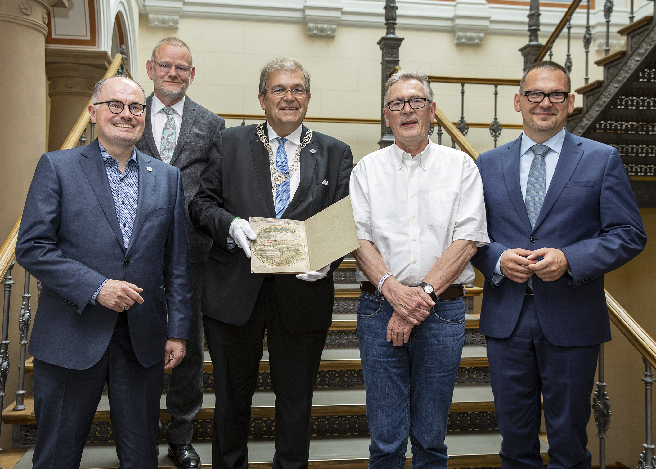Die Universitätsbibliothek Rostock ist es gelungen, mit Hilfe von verschiedenen Förderern die erste Folioausgabe des Novus Mundus, des Briefs über die Neue Welt, von Amerigo Vespucci zu erwerben. „Damit kehrt im Jubiläumsjahr der Universität einer der seltensten und bedeutendsten Drucke nach Rostock zurück, der hier im ersten Jahrhundert der Universität entstanden ist“, freut sich Bibliotheksdirektor Robert Zepf. „Bisher waren weltweit nur zwei Exemplare bekannt: das eine in der Universitätsbibliothek in Frankfurt am Main und das andere in der British Library in London.“ Der heute erstmals präsentierte Druck wird schon ab der kommenden Woche in der Jubiläumsausstellung zur 600-Jahr-Feier der Universität zu sehen sein: Die Ausstellung unter dem Motto „Menschen – Wissen – Lebenswege“ eröffnet am 20. Juni im Kulturhistorischen Museum Rostock.