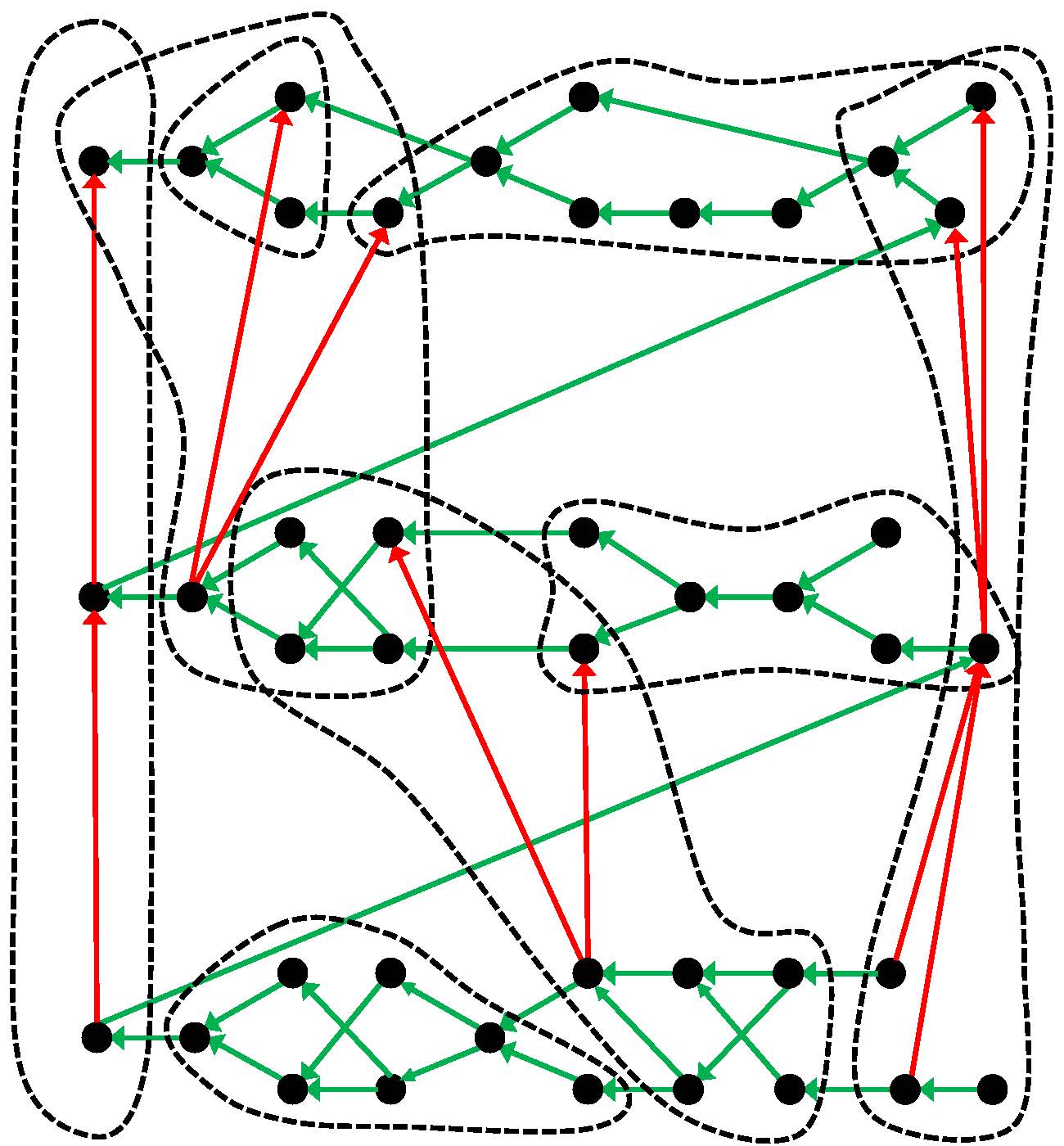 A slightly different periodic table: The table of chemical elements, which goes back to Dmitri Mendeleev and Lothar Meyer, is just one example of how objects – in this case the chemical elements – can be organized in such a system. The researchers from Leipzig illustrate the general structure of a periodic table with this example: The black dots represent the objects ordered by the green arrows. Using a suitable criterion, the objects can be classified into groups (dashed lines) in which the red arrows create a sub-order.