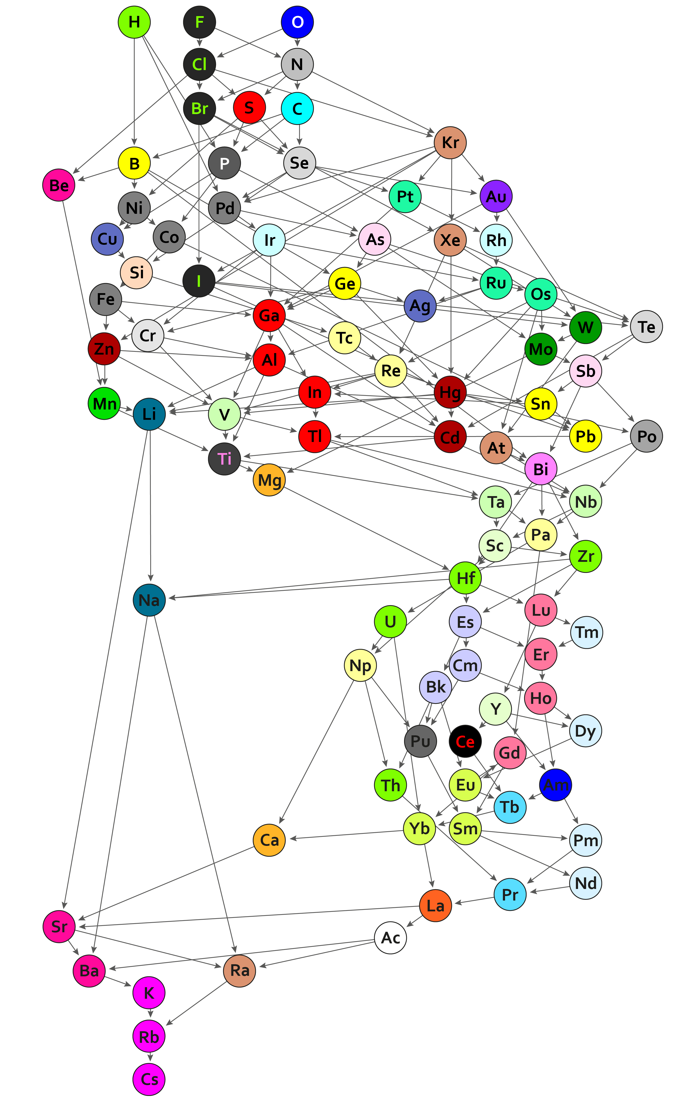 In the 44 classes of chemical elements, there are some similarities with the main groups of Mendeleev’s and Meyer’s[1] periodic table. For example, the alkali metals sodium and lithium are found in one group because they form the same simple salts with halogens such as chlorine or fluorine. Like the elements themselves, the bonds of the four halogens (fluorine, chlorine bromine, and iodine) are also found in the same group. However, there are also classifications that differ significantly from those in the conventional periodic table. For example, carbon and silicon are no longer in the same class because they form very different compounds.