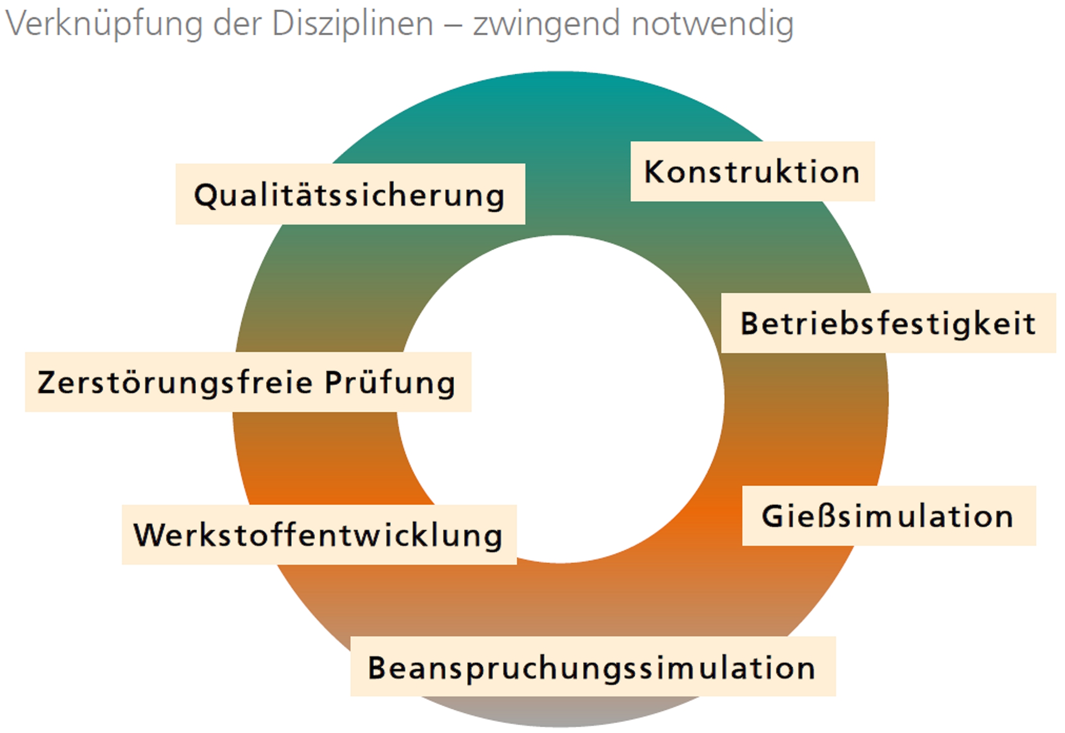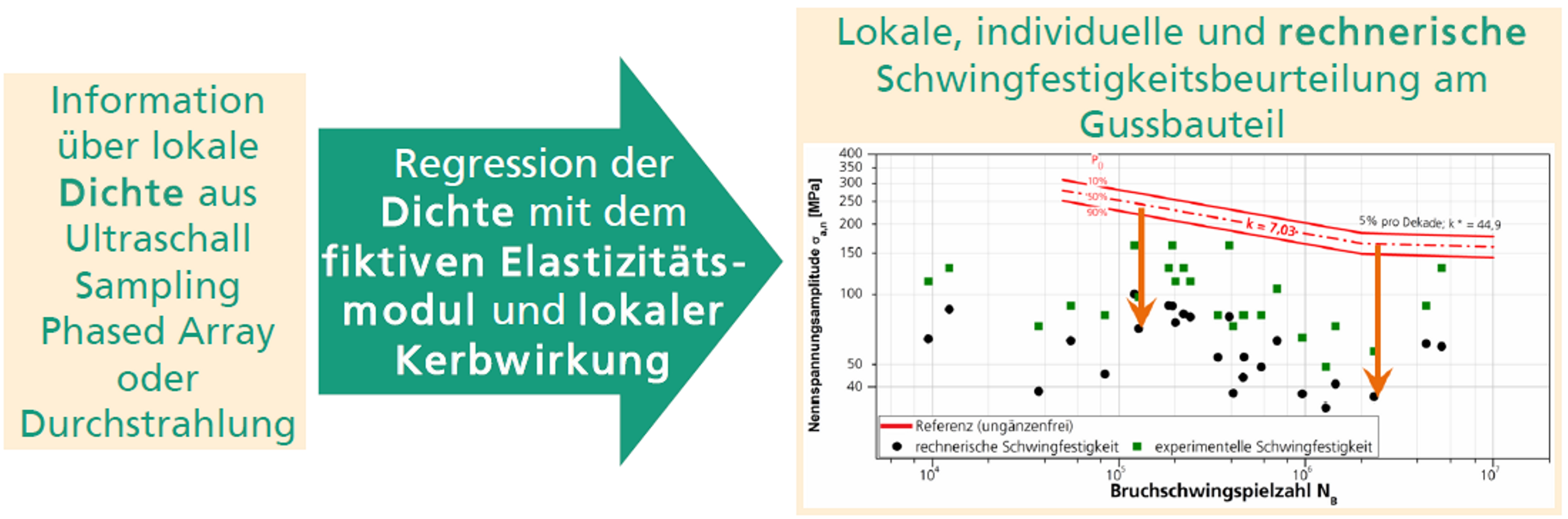Auch die Hersteller von Massengussprodukten streben bei hoher Prozessgeschwindigkeit eine zuverlässige Bauteilherstellung ohne Ausschuss an. Im Rahmen der Bauteillebensdauerbewertung und der Qualitätssicherung gilt es deshalb zu klären, in wie weit die Bauteile trotz eventuell lokal vorliegender Ungänzen wie Lunker, Poren oder Drosseinschlüsse für ihren jeweiligen Anwendungszweck genutzt werden können. Insbesondere neue zerstörungsfreie Prüfverfahren auf Basis von Ultraschall oder Durchstrahlung können hierzu wichtige Hinweise und Parameter zu den vorliegenden Ungänzen liefern, die in der Betriebsfestigkeit für eine Lebensdauerbeurteilung solcher Bauteile verwendet werden können.