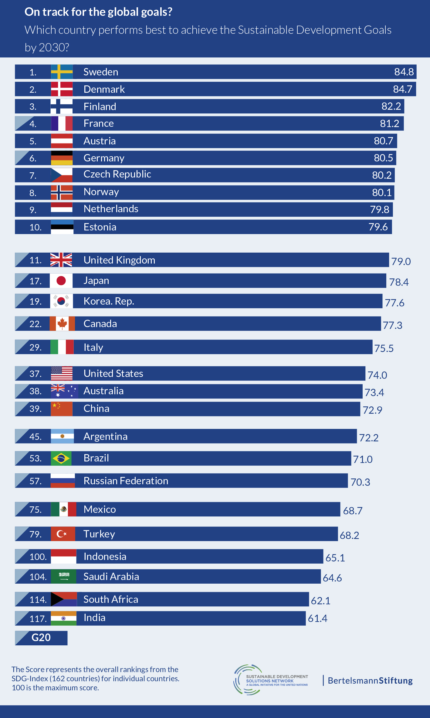 The SDG Report is the only global comparative study of developed and developing countries on the achievement of the UN Sustainable Development Goals. The index was developed by the Bertelsmann Stiftung in collaboration with the Sustainable Development Solutions Network (SDSN) and UN Special Adviser Jeffrey Sachs. The study compared data from 193 countries. The SDG index allows all countries to be compared based on country profiles and a traffic light system. The UN Sustainable Development Goals are a collection of 17 global goals and 169 associated targets with a social, economic and environmental aspect. The indicators were designed and selected in collaboration with the SDSN, a consortium of research institutes to support the implementation of the UN development goals.