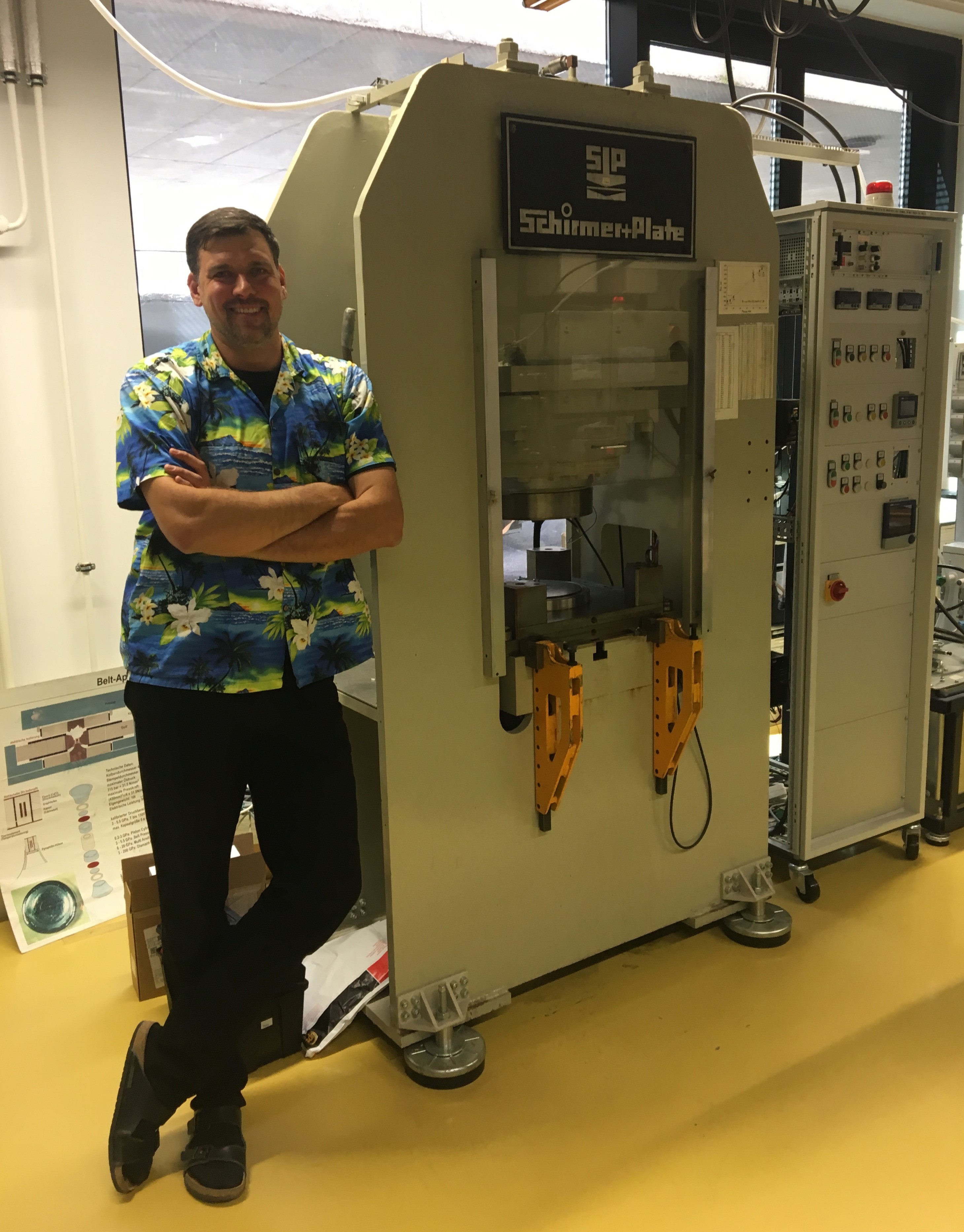 Caption: Prof. Horst Marschall in front of one of the high-pressure belt apparatus in the Institute for Geosciences used to simulate the formation of inclusions in diamonds