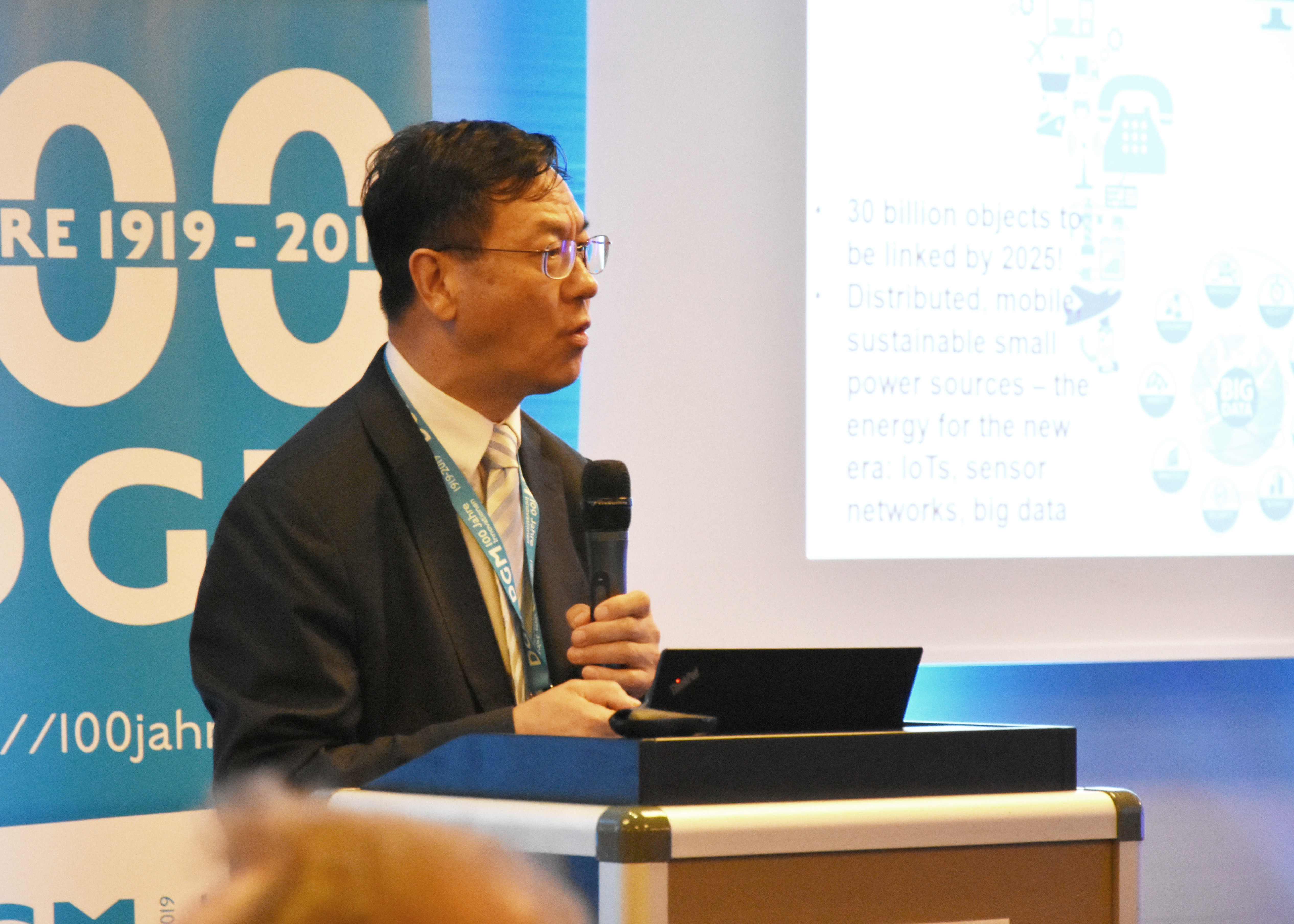 Bildunterschrift: In seinem Vortrag erläuterte Wang das Prinzip hinter den von ihm entwickelten Nanogeneratoren, die selbstständig Energie erzeugen.