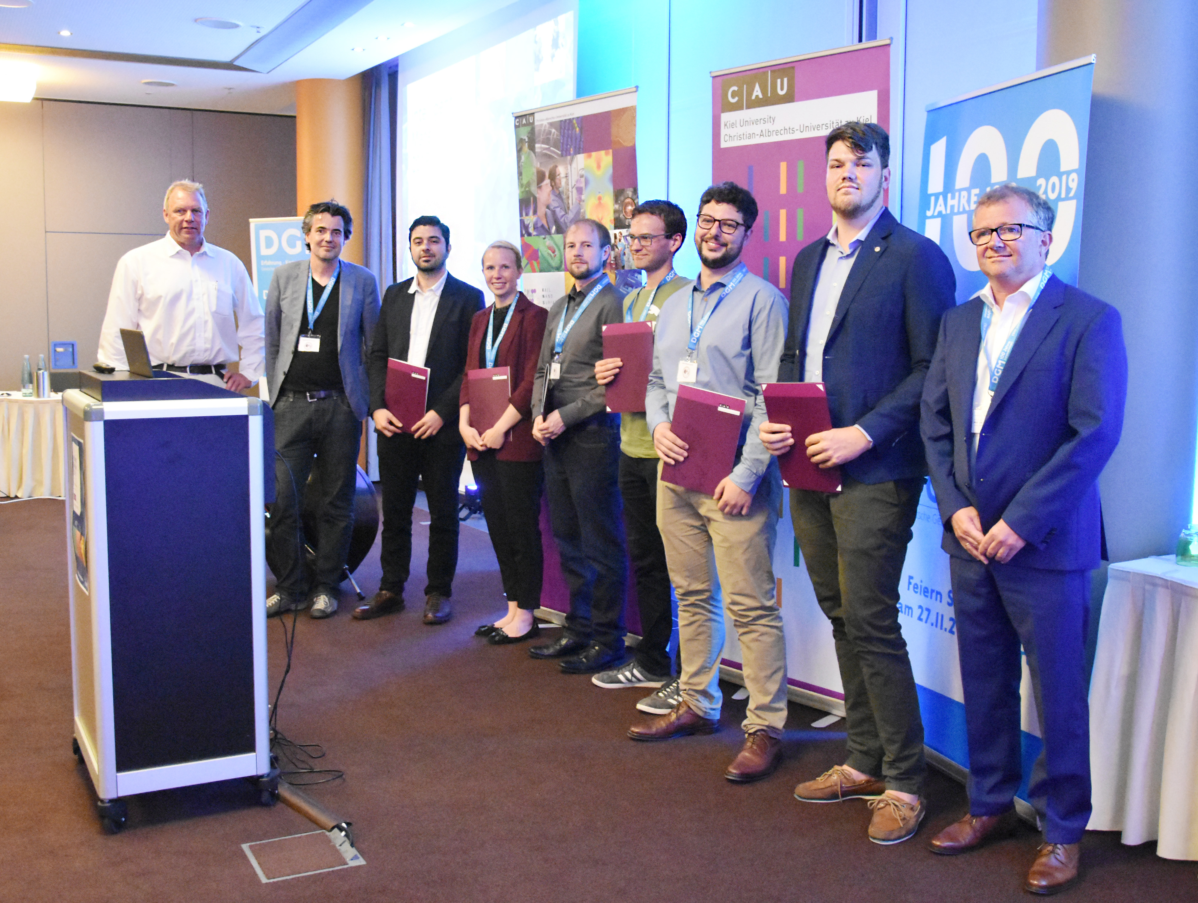 Bildunterschrift: Außerdem wurden die besten Dissertationen in den Kieler Nanowissenschaften ausgezeichnet: CAU-Präsident Kipp (v. links), KiNSIS-Sprecher Prof. Dr. Kai Rossnagel, Dr. Emre Kizilkan, Dr. Nadja Stucke, Dr. Thomas Knaak, Dr. Tobias Dornheim, Dr.-Ing. Fabian Schütt, Dr.-Ing. Michael Timmermann, KiNSIS-Sprecher Prof. Dr. Jeffrey McCord.