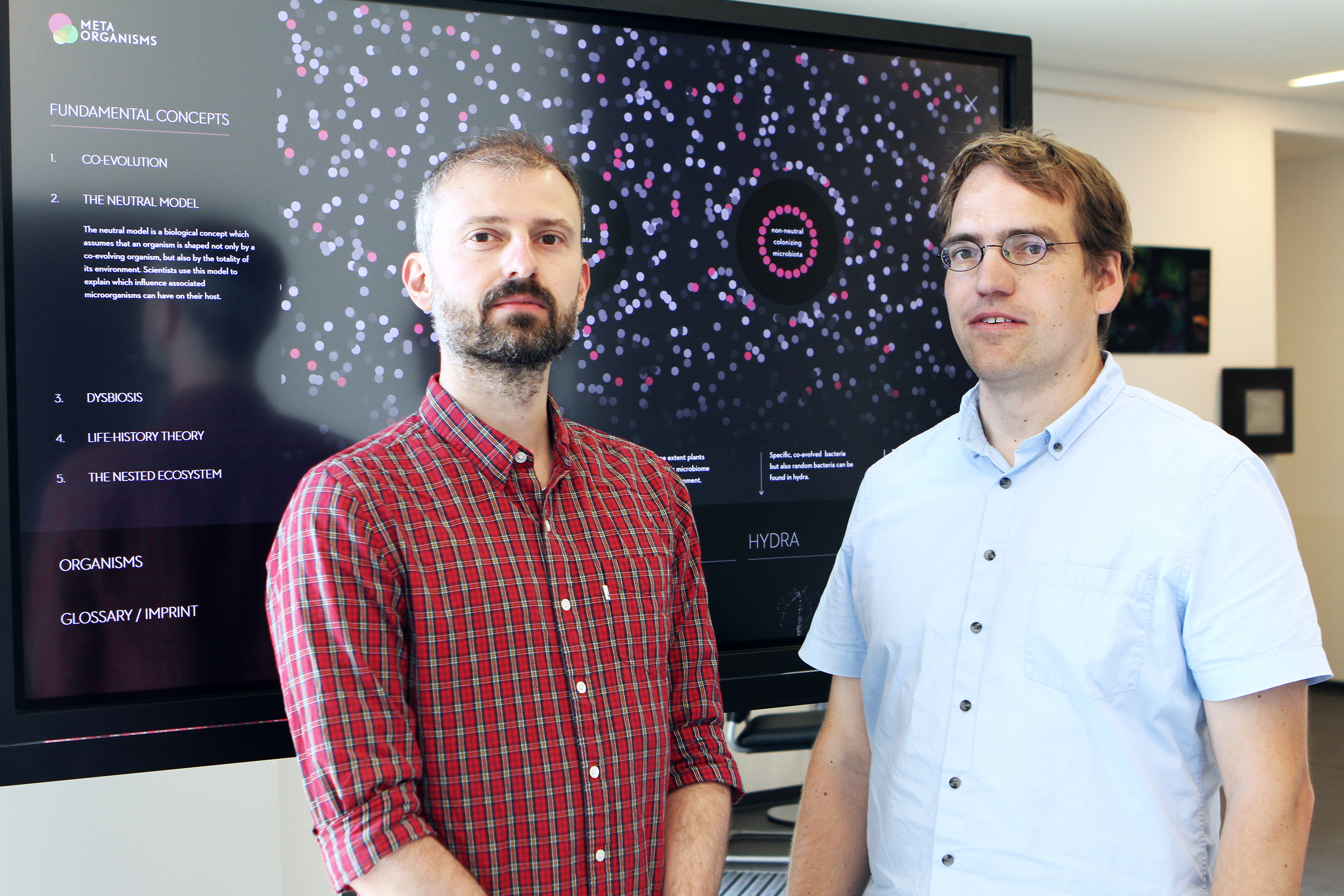 Bildunterschrift: Dr. Michael Sieber (links) und Prof. Arne Traulsen vom Plöner Max-Planck-Institut für Evolutionsbiologie entwickelten gemeinsam mit Forschenden des Kieler SFB 1182 das Modell des neutralen Metaorganismus.