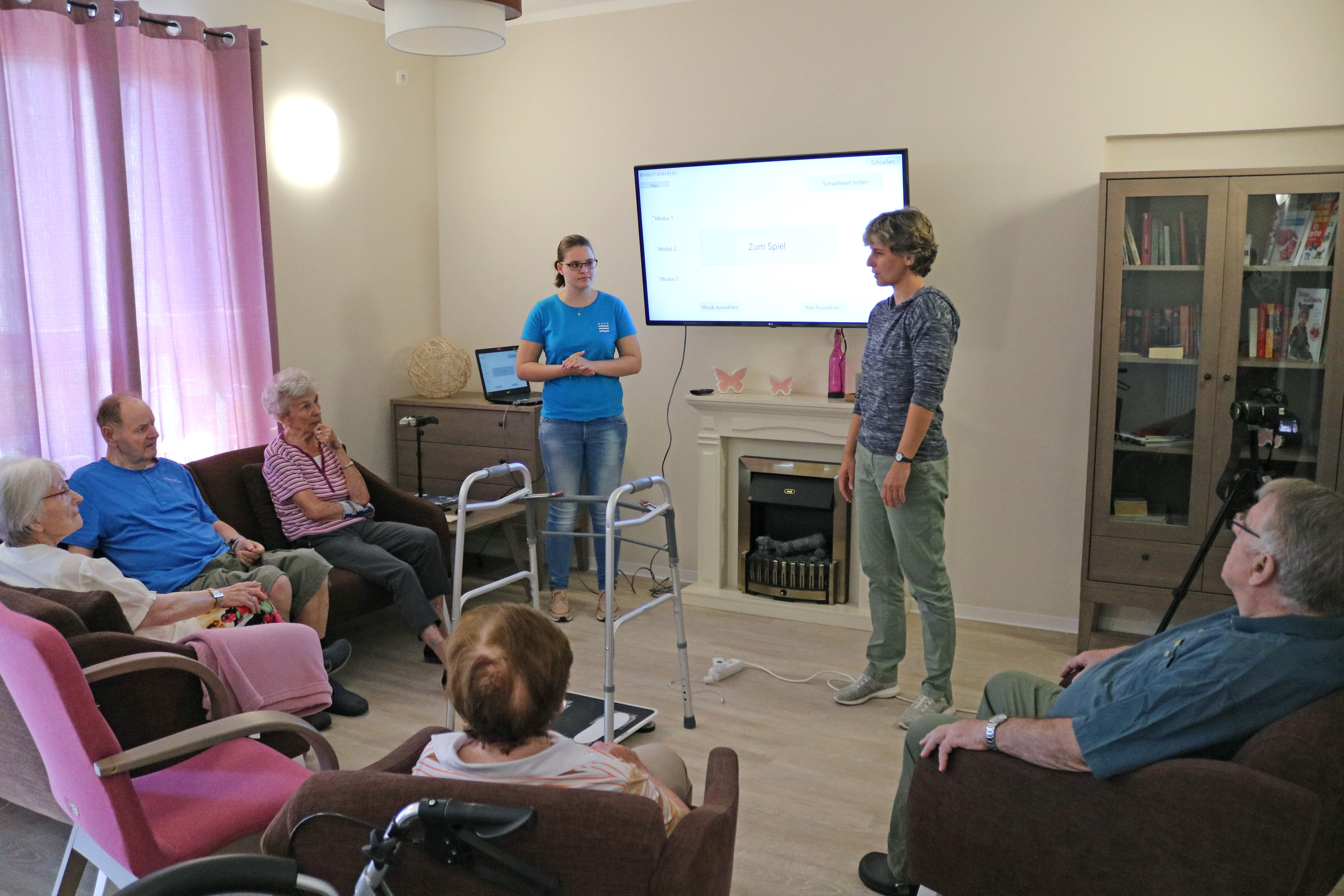 Bei einer Fokusgruppe mit Seniorinnen und Senioren mit beginnender Demenz steht ein älterer Herr auf einer schwarzen Platte, auf der die Umrisse von Füßen aufgeklebt sind. Wenn er seinen Körper etwas nach rechts verlagert, erscheinen rötliche Blasen, nach vorne bläuliche, nach hinten grüne. Auf diese Weise lernen die Teilnehmenden das Prinzip des Bewegungsspiels kennen. Kurz darauf darf eine Bewohnerin das neue Spiel, eine Art Memory, testen: Auf dem Bildschirm zu sehen sind gleichfarbige Plättchen, die durch Gewichtsverlagerung umgedreht werden. Nach und nach erscheint ein Bildmotiv, das die Teilnehmenden früher oder später erkennen.