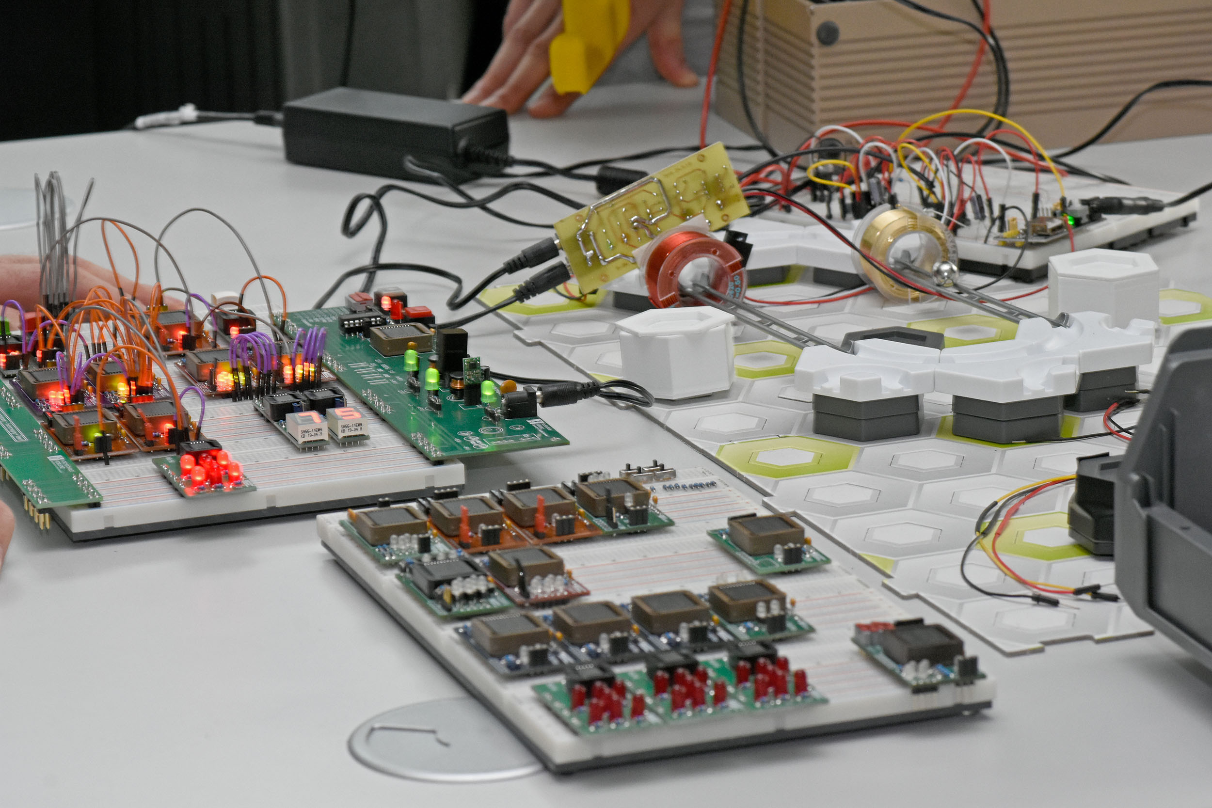 Der Digitalbaukasten enthält auf dem Basis-Steckbrett bereits alle Grundverbindungen, es werden nur wenige Signalverbindungen benötigt. Außerdem wird mit einem Handgriff etwa aus einer UND-Schaltung eine ODER-Schaltung. LEDs an allen Ein- und Ausgängen zeigen die Logikzustände 0 und 1 an, also zum Beispiel, ob Strom fließt, oder ob kein Strom fließt. „Der Herzschlag der Schaltung, der Takt, kann beliebig von Hand oder aber regelmäßig von einem Takt in der Sekunde bis zu 10 Millionen Takte pro Sekunde eingestellt werden“, erklärt Gick. So könne man den Prozess, der eigentlich rasend schnell sei, ganz langsam beobachten und nachvollziehen. „Dem Erfindergeist sind keine Grenzen gesetzt. Wir können mit der digitalen Schaltung auch eine Kugelbahn steuern, indem eine stromdurchflossene Spule die rollende Kugel beschleunigt.“
