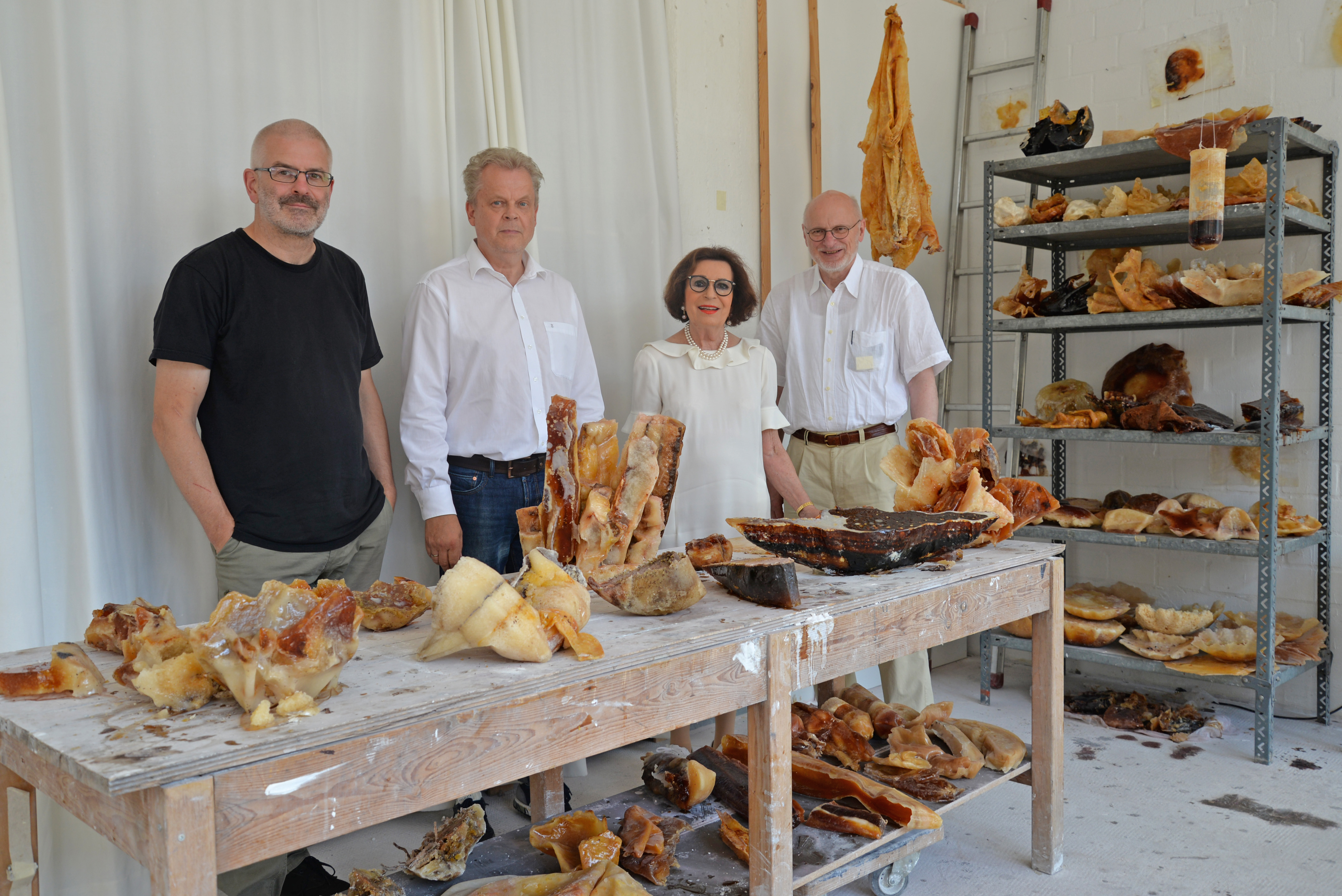 Bildunterschrift: Die Jury des Piepenbrock Kunstförderpreises mit der preisgekrönten Arbeit „Liaison“ von Nicole Widner: (v.l.) Prof. Thomas Rentmeister (Braunschweig), Universitätspräsident Prof. Dr. Wolfgang Lücke, Maria-Theresia Piepenbrock, Prof. Klaus Dierßen (Hildesheim).