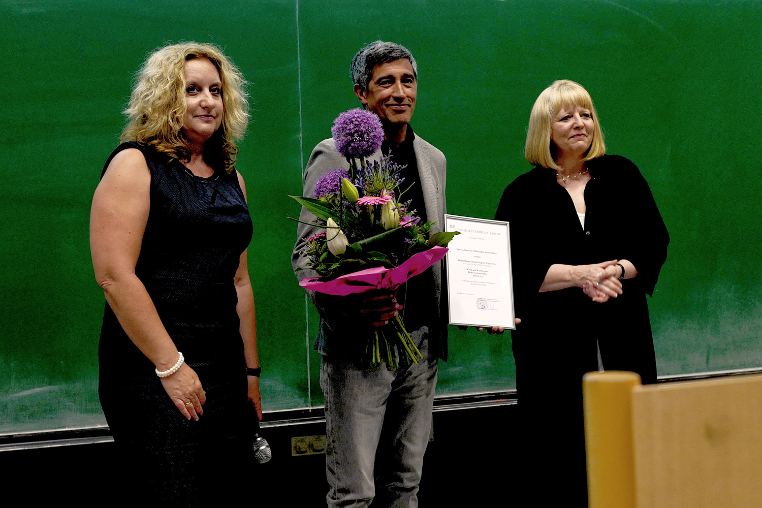 Dem Grenzgänger Yogeshwar gehe es darum, Naturwissenschaften für Laien fassbar zu machen. Er beschäftige sich nicht nur mit der Wissenschaftsvermittlung, sondern hinterfrage diese auch immer kritisch und zeige einen hohen Anspruch an Bildung, erklärte die Präsidentin der Universität Koblenz-Landau, Prof. Dr. May-Britt Kallenrode.