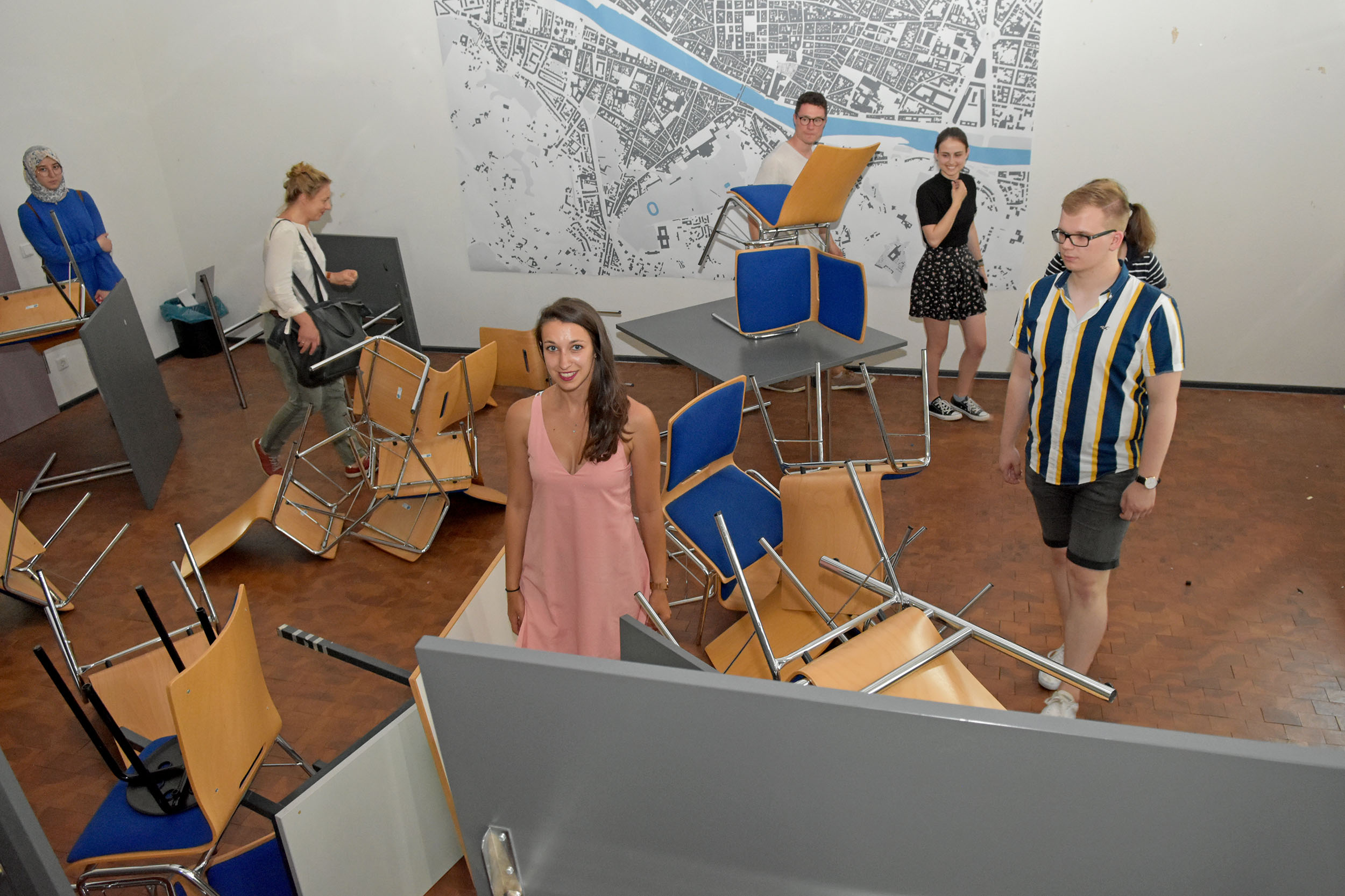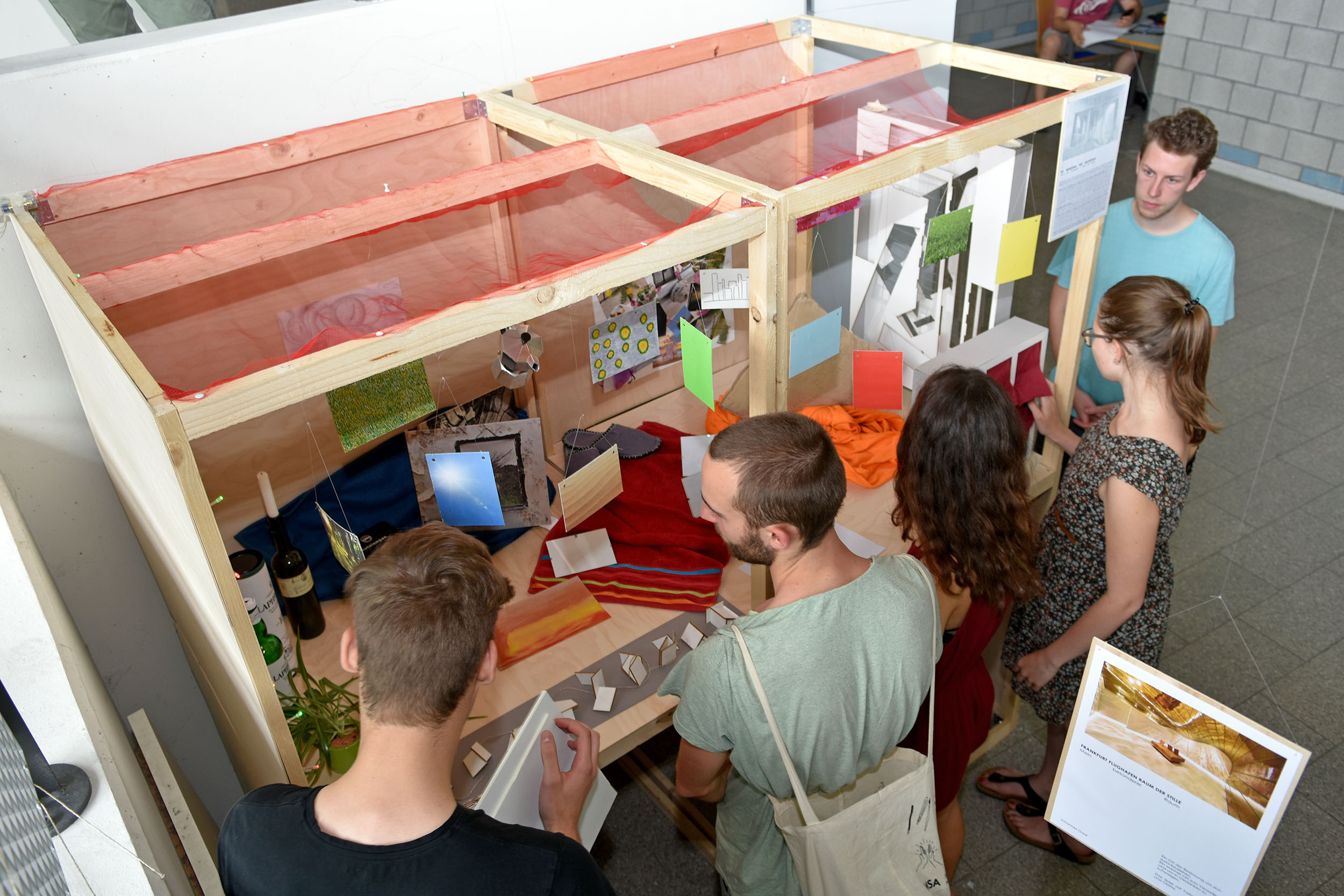 Besonders viel Anklang fand eine Übung, bei der einzelne Gruppen komplette Seminarräume umgestalten und die dabei entstehende Stimmung erspüren durften. Einer dieser Seminarräume war noch während der Vernissage der Ausstellung zu sehen, bei der die Besucherinnen und Besucher teils inspiriert, teils verstört und immer schweigend zwischen umgestürzten Stühlen und aufgestellten Leitern umhergingen. „Diese 1:1-Umsetzungen waren das Spannendste“, berichtet Björn Simon, Architekturstudent im 6. Bachelorsemester, „hier brauchten wir nicht an einem kleinen Modell zu arbeiten, sondern konnten direkt im großen Raum ausprobieren, wie die Gestaltung auf den Menschen und seine Emotionen wirkt.“ Seine Kommilitonin Vera Gerhartz aus dem 4. Semester ergänzt: „Es war sehr spannend zu sehen, wie enorm schon Kleinigkeiten einen Raum verändern können.“