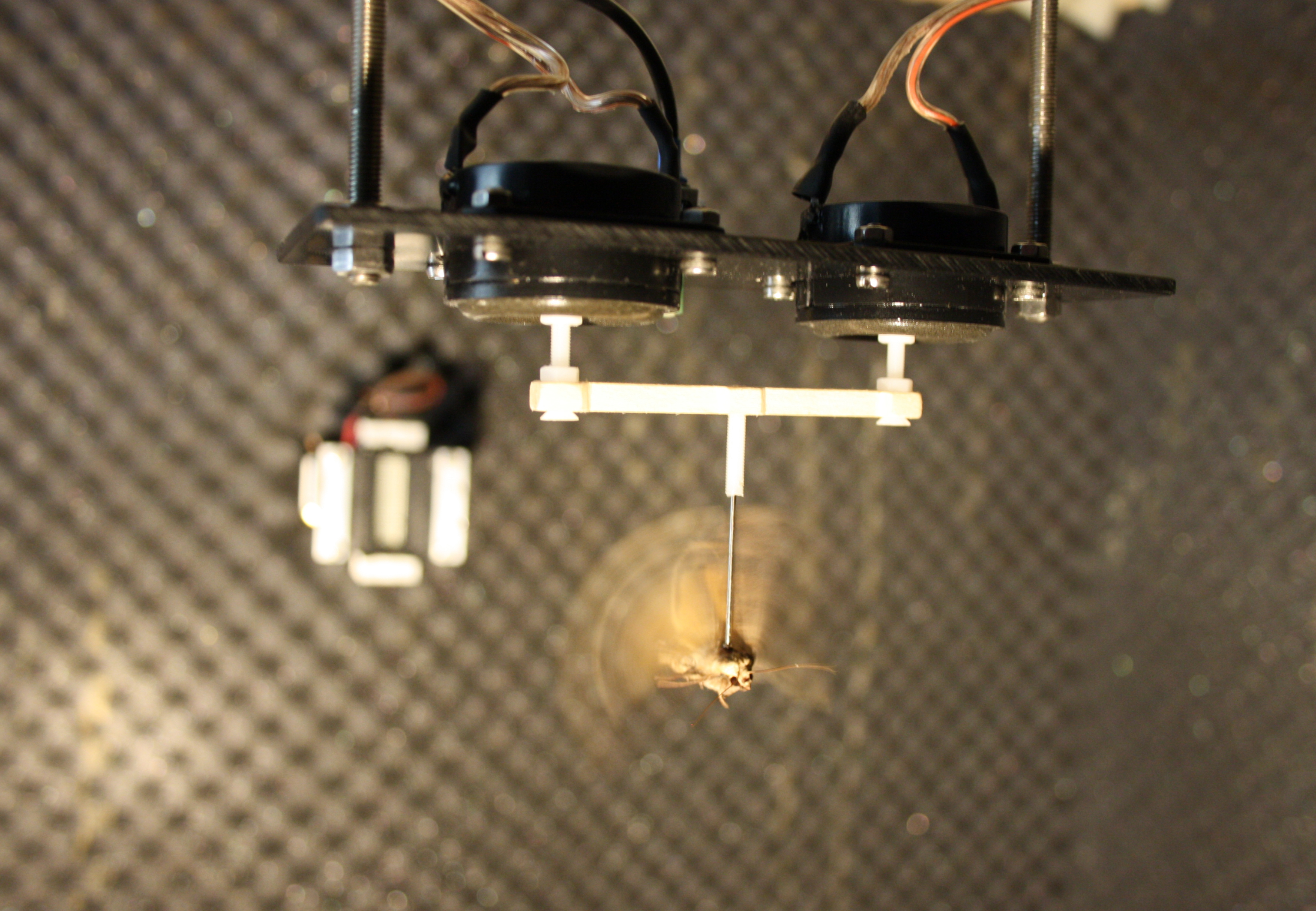 In this new study, these erratic escape movements of hearing moths were examined in detail by Theresa Hügel and Holger Goerlitz of the Max Planck Institute for Ornithology. In an acoustic chamber, they fixed moths carefully to small metal rods in a way that they were still able to fly. The rod was connected via a horizontal bar to the membranes of two loudspeakers. The flight movement of the insect thus moved the membranes, generating voltage fluctuations, which the researchers recorded. In this way, they were able to measure the flight forces and the escape behavior of the flying moth. The researchers tested a total of 172 individuals from eight different moth species, simulating the same predation threat by presenting all the same bat-like sound.