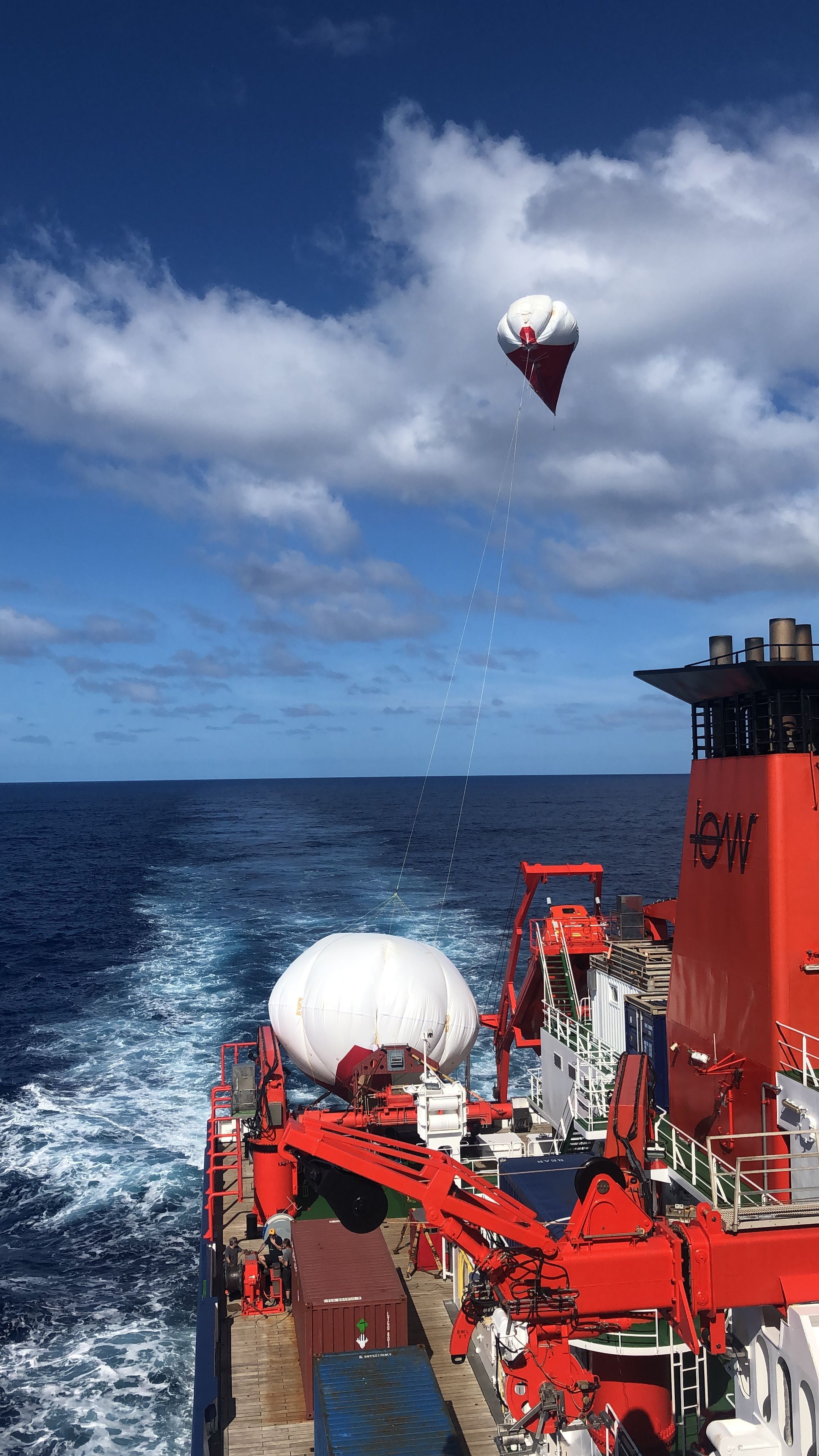 Der CloudKite nimmt vom Schiff aus Messungen in tiefen Wolken vor. Bis zu zwei Kilometer hoch kann er dabei in die Luft steigen. Er besteht aus zwei Ballondrachen, einem oberen mit einem Volumen von ca. 34 m3 sowie aus dem Hauptballon mit einem Volumen von 250 m3. Schon zwei Tage vor dem Auslaufen haben sich die MPIDS-Forscher in Montevideo getroffen, um die beiden Ballone auf dem Schiff zu installieren. Beide wurden in den ersten drei Tagen auf dem Schiff erfolgreich mit Helium gefüllt. Mit ihren Ballondrachen können die Forscher über einen längeren Zeitraum in verschiedenen Höhen Messungen durchführen. Dabei misst die Göttinger Vorrichtung die Dynamik und Turbulenz mit einer beispiellosen Genauigkeit.