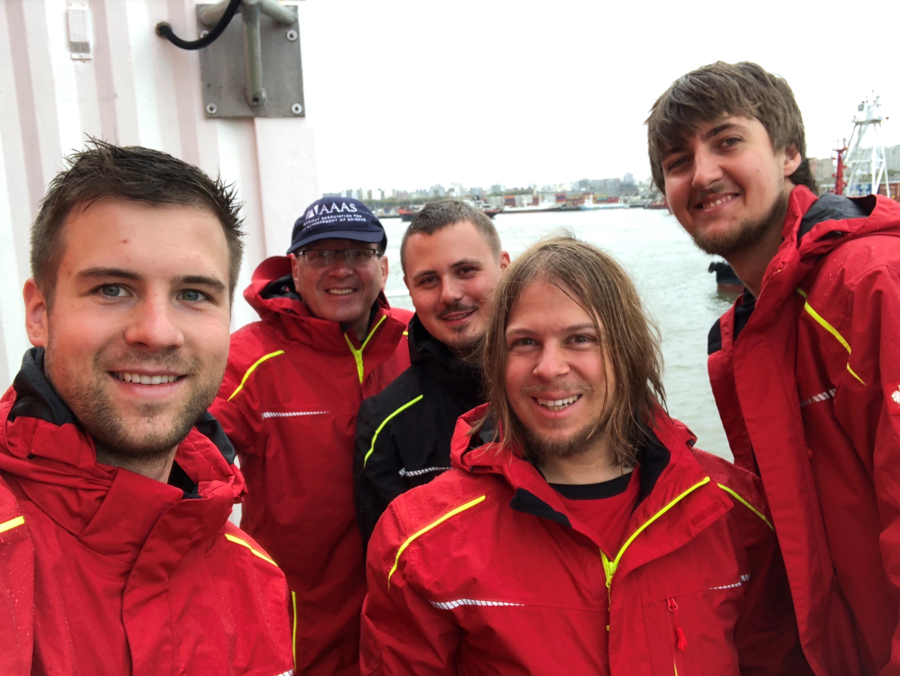 Beim Start im Hafen von Montevideo in Uruguay hingen die Wolken zwar tief. Dennoch bestieg das CloudKite-Team bestehend aus MPIDS-Direktor Eberhard Bodenschatz, Marcel Schröder, Marcel Meyer, Oliver Schlenczek und Philipp Höhne das Forschungsschiff Maria S. Merian voller Erwartungen und Vorfreude. Um 9 Uhr Ortszeit ertönte das Schiffshorn – laut und tief: der Startschuss für die 3-wöchige Messkampagne. Mit 20 Wissenschaftlern aus sieben unterschiedlichen Instituten war die Maria S. Merian voll besetzt.