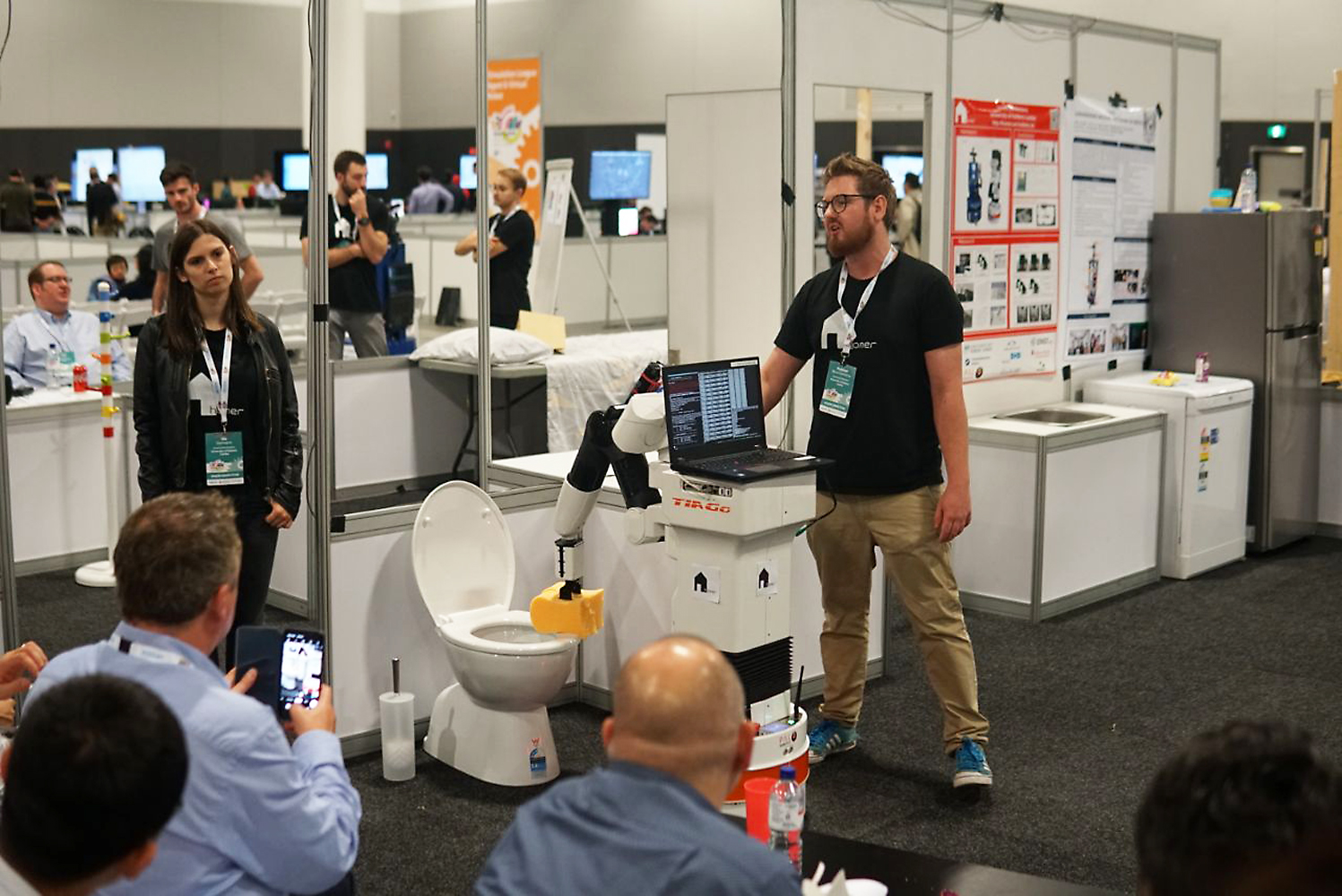 Im Finale zeigte das Team um Leiter Raphael Memmesheimer einen Ansatz zum adaptiven Lernen durch Demonstration, autonome semantische Exploration sowie kontaktforcierende Manipulation am Beispiel des Reinigens einer Toilettenbrille mit einem Schwamm-Greifer. Während des anschließenden Symposiums präsentierte das Team einen Ansatz zur Gestenerkennung auf Video-Sequenzen.