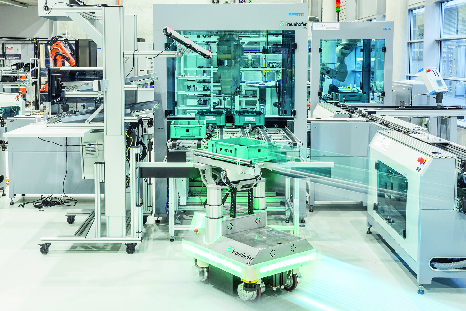 Fahrerlose Transportsysteme (FTS) und mobile Roboter sind ein Schlüsselelement, um eine schnelle, zuverlässige und kosteneffektive innerbetriebliche Logistik zu etablieren. Mit Technologien der Künstlichen Intelligenz (KI) wie dem Maschinellen Lernen oder verbesserten Sensoren und Konzepten zur Lokalisierung der Fahrzeuge können neue Anwendungen in Produktion und Logistik realisiert werden. Das Teilen von Umgebungsinformationen über die Cloud ermöglicht FTS, sich selbst zu organisieren und Routen durch Fabriken und Lager kooperativ optimal zu planen. Zusätzlich lassen sich Bauraum und Nutzlast optimieren.