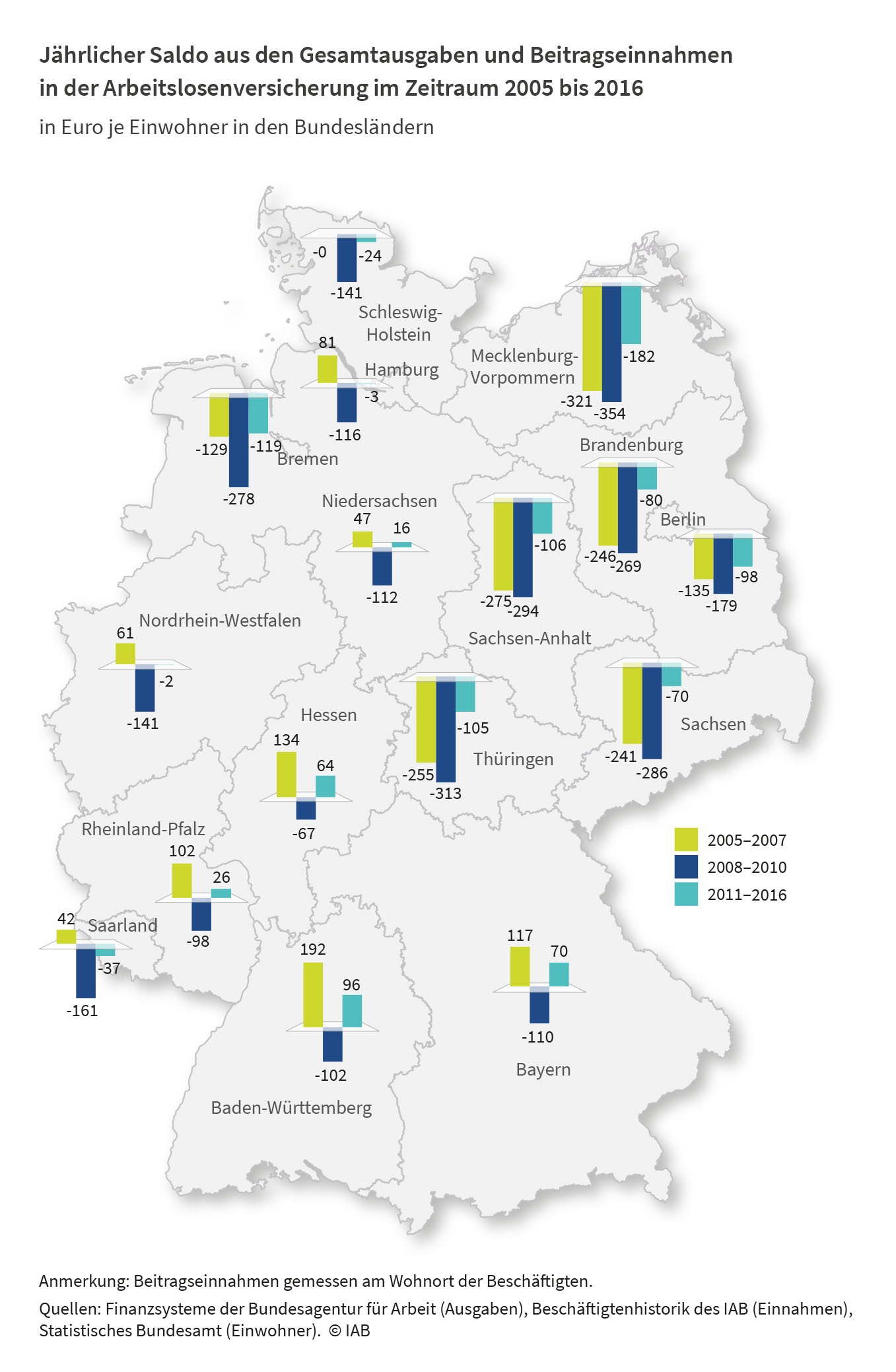 Die regionale Umverteilung ist sowohl bei der Arbeitslosenversicherung wie beim Länderfinanzausgleich nach wie vor von einem starken West-Ost-Gefälle geprägt. Innerhalb Westdeutschlands zeichnet sich ein Süd-Nord-Gefälle ab. Insbesondere in Bremen, das unter den westdeutschen Bundesländern die höchste Arbeitslosigkeit aufweist, liegen die Beiträge zur Arbeitslosenversicherung deutlich unter den Ausgaben. In den süddeutschen Regionen werden hingegen - abgesehen von den Krisenjahren von 2008 bis 2010 - mehr Beiträge erzielt als Ausgaben getätigt.