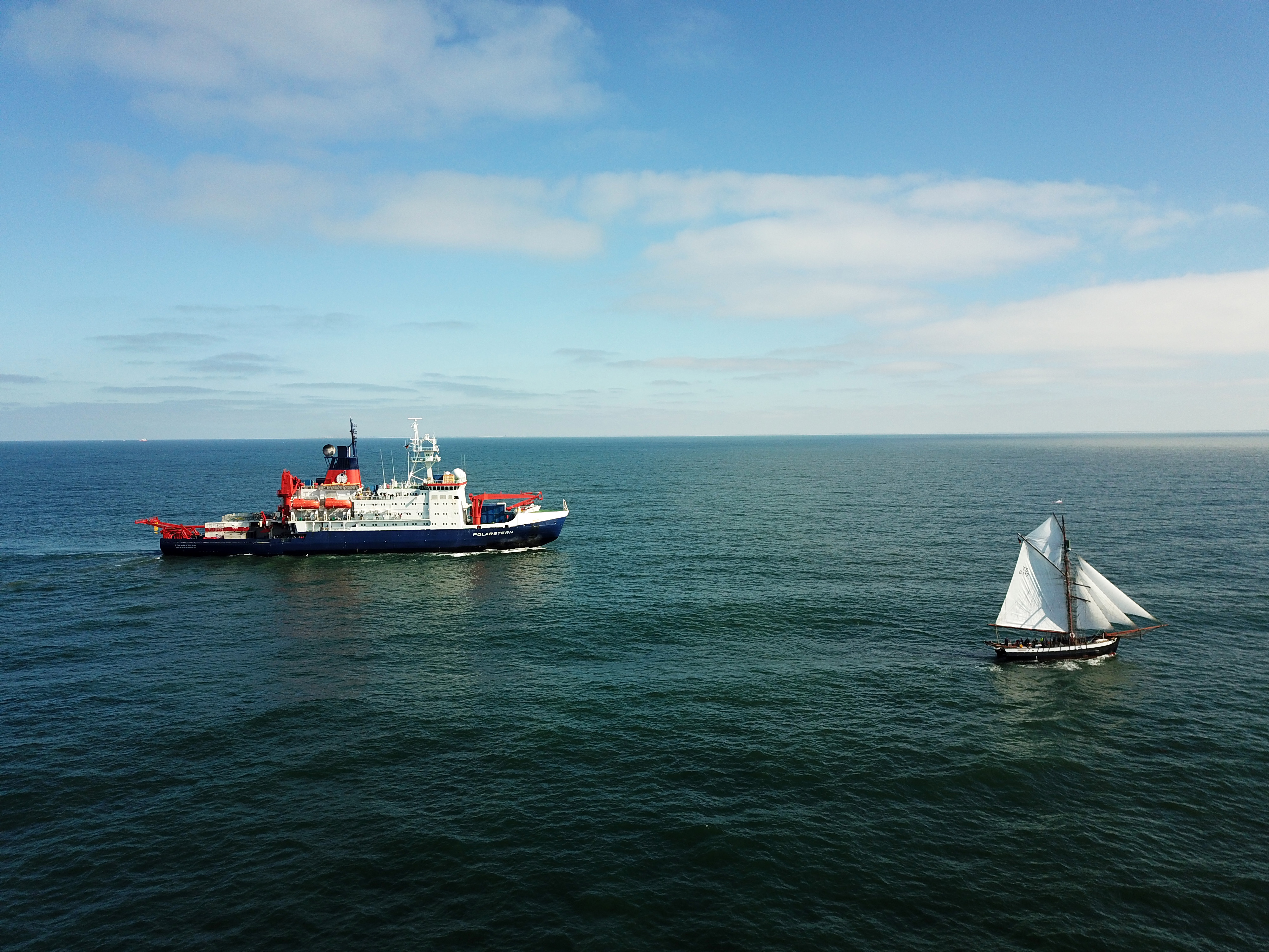 After half a year in the southern hemisphere, the POLARSTERN - one of the most important research vessels in the world - has returned to her home port Bremerhaven. The icebreaker of the Alfred Wegener Institute / Helmholtz Centre for Polar and Marine Research (AWI) was welcomed by the GRÖNLAND near Wangerooge, which set sail in 1868 for the first German expedition to the Arctic Ocean and today belongs to the fleet of the German Maritime Museum (DSM). The photos and drones of the two ships are to be used in the future as part of the exhibition "360° POLARSTERN - A Virtual Research Expedition" at the DSM and serve as a lasting reminder of the historic encounter between the two ships.