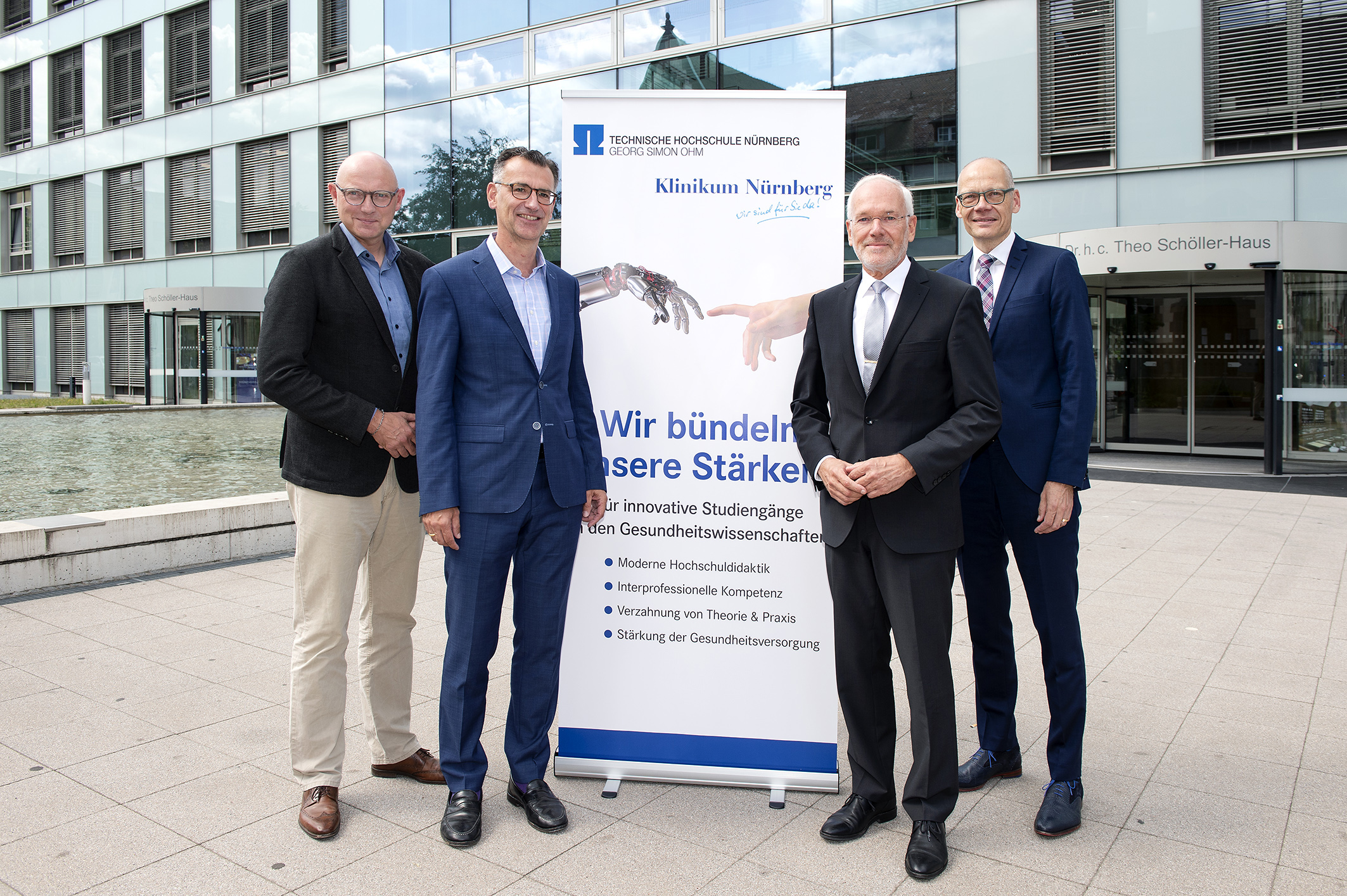 Die rasanten technologischen und fachlichen Entwicklungen im Gesundheitswesen und die gesetzlich beschlossene Akademisierung vieler Gesundheitsberufe bringen in Nürnberg eine außergewöhnliche Kooperation hervor: Die Technische Hochschule Nürnberg und das Klinikum Nürnberg bündeln ihre große Expertise und entwickeln künftig gemeinsam Studiengänge für das Gesundheitswesen. Beide Partner bilden mit der Verbindung von akademischer Ausbildung und Anwendungskompetenz eine ideale Kombination. In einer neuen Hochschuleinrichtung wollen sie zunächst einen primärqualifizierenden Studiengang Hebammenkunde anbieten, später sollen ein Studiengang zu Digitalisierung & Robotik im Gesundheitswesen und Studiengänge u.a. in der Pflege sowie weiteren Gesundheitsberufen folgen – ein echter Mehrwert für die Metropolregion.