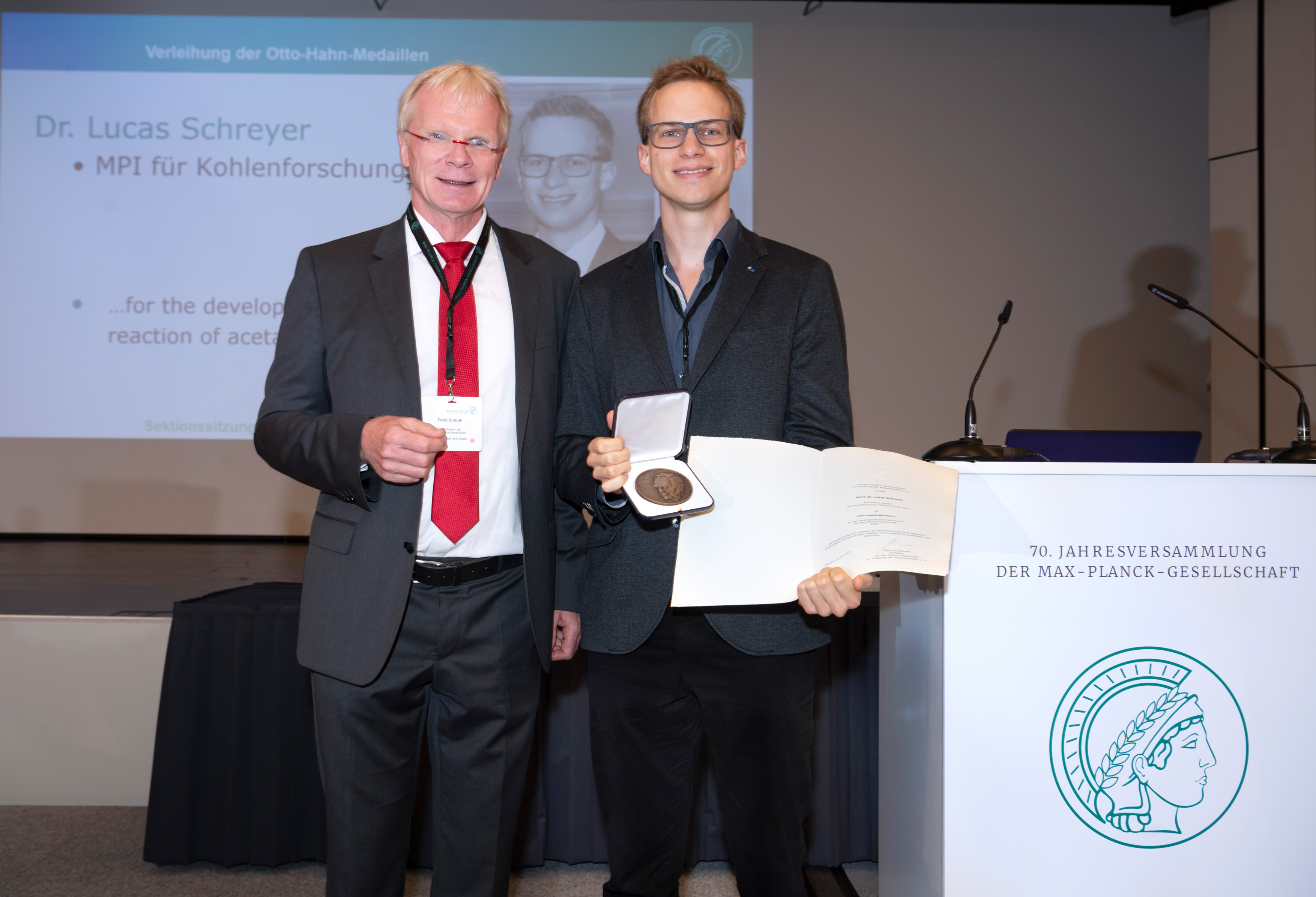 Schon die zweite große Auszeichnung in seiner noch jungen Forschungskarriere erhält Dr. Lucas Schreyer, Postdoktorand am Max-Planck-Institut für Kohlenforschung. Der Nachwuchswissenschaftler wurde jetzt mit der Otto-Hahn-Medaille für seine Beiträge zur Entwicklung einer allgemein anwendbaren, enantioselektiven Mukaiyama-Aldolreaktion von Acetaldehyd-Enolsilanen mit Aldehyden auf der Jahresversammlung der Max-Planck-Gesellschaft in Hamburg geehrt. Die Auszeichnung ist mit einem Anerkennungsbetrag von 7500 Euro verbunden und soll besonders begabte Nachwuchswissenschaftler zu einer späteren Hochschul- oder Forscherkarriere motivieren.
