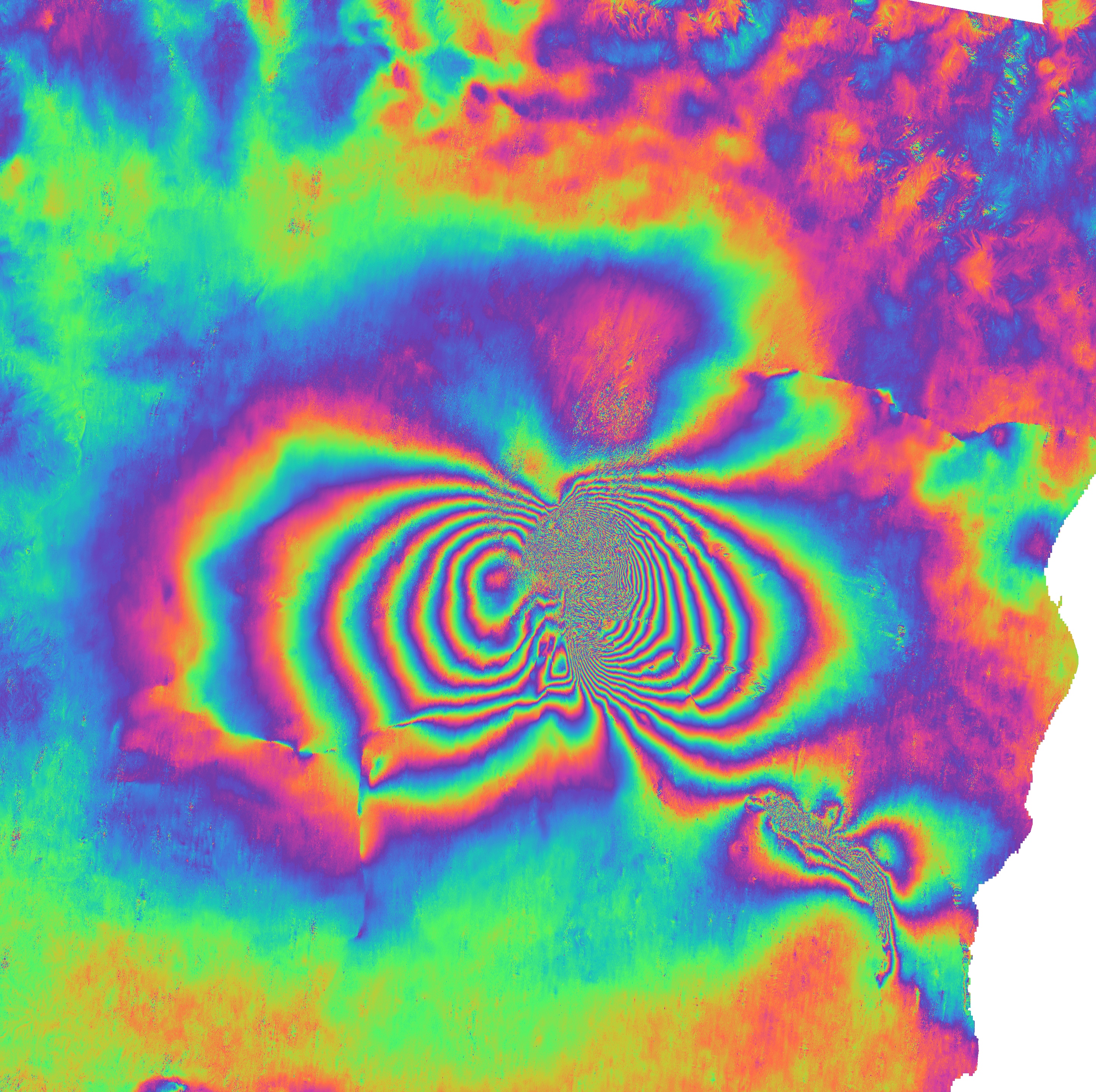Interferogramm des Ausbruchs des Ätna im Dezember 2018 in Süditalien, basierend auf Sentinel-1 Satellitenbildern. Interferogramme bilden Bewegungen der Erdbodenoberfläche räumlich ab. (Bild: MOUNTS-System, Daten: ESA Sentinel, Erstellt: Sébastien Valade, GFZ).