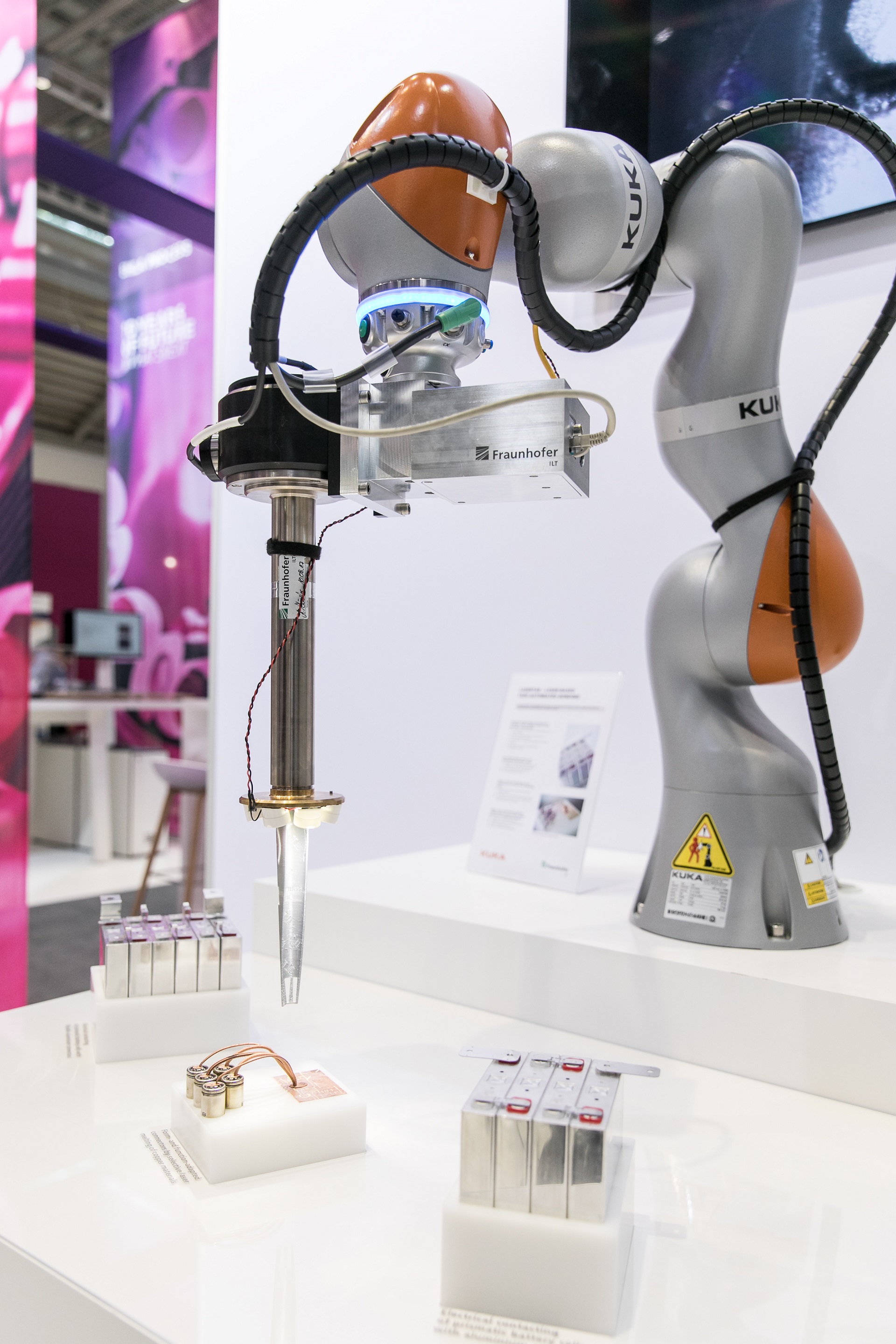 Die Aachener demonstrierten auf dem Messestand auch das Schweißen von Batteriezellen mit Roboterunterstützung. Mit dem Prozess des Laser-Based Tape-Automated Bonding (LaserTAB) zeigten sie, wie Roboter, Laserscanner und Prozessüberwachung zusammen funktionieren. Der mitfühlende Leichtbauroboter der Firma KuKa übernahm dabei noch eine besondere Fähigkeit: Als »intelligent industrial work assistant (iiwa)« eignet er sich für die enge Zusammenarbeit von Menschen und Roboter. Dank Gelenkmomenten-Sensoren erkennt er Kontakte und reduziert sofort Kraft und Geschwindigkeit.