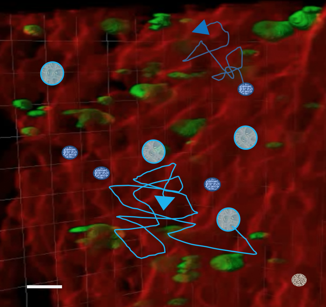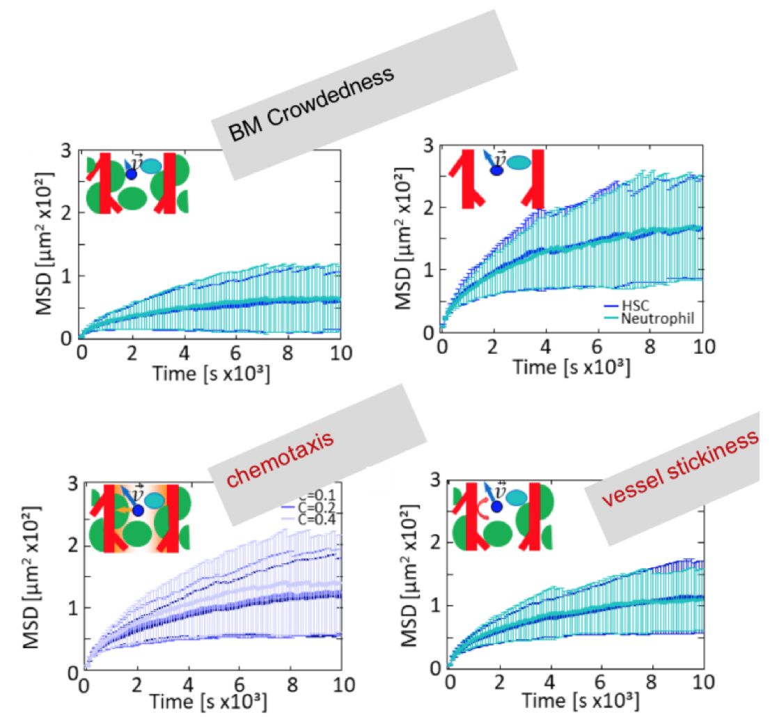 In dieser Studie stellten die Wissenschaftler fest, dass die Migration von hämatopoetischen Stammzellen und Neutrophilen von der Größe und Verteilung der Megakaryozyten abhängt. Daher legen diese Simulationen nahe, dass Megakaryozyten eine wichtige Rolle bei der Zellmigration spielen, auch wenn sie nicht selbst migrieren. Stattdessen stellen die großen Megakaryozyten passive Hindernisse dar und beeinflussen somit die Migration anderer Zellen, wie hämatopoetischer Stammzellen und Neutrophilen, im Knochenmark erheblich. In der Tat bestätigte die Intravitalmikroskopie, dass die Mobilität der Neutrophilen bei Mäusen mit verminderter Thrombozytenzahl, bei denen das Megakaryozytenvolumen erhöht ist, verringert war (siehe Abbildung 2).