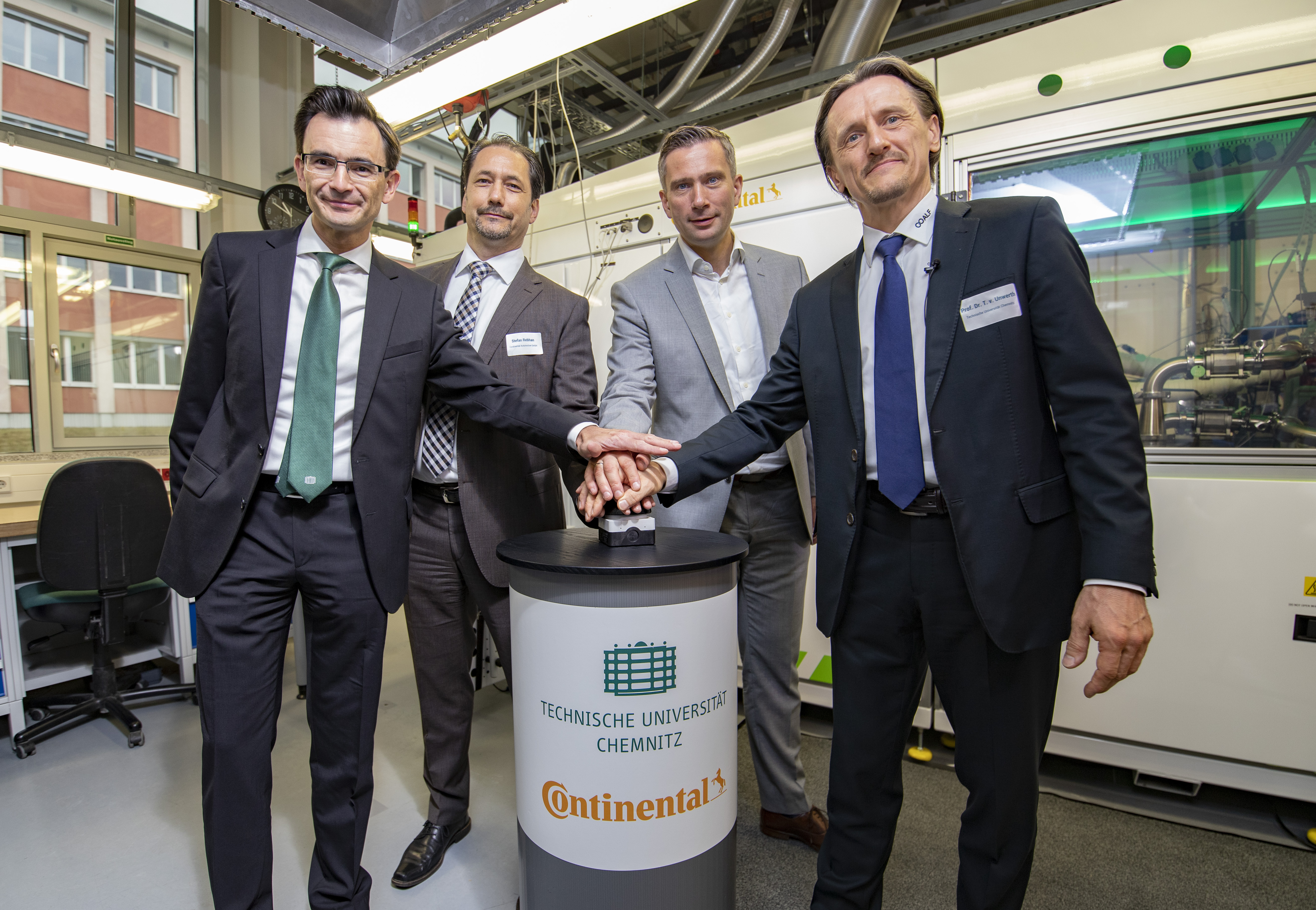 Regensburg, Chemnitz, 17. Juli 2019. Das Technologieunternehmen Continental baut den Bereich Brennstoffzellentechnologie weiter aus. Im Rahmen einer strategischen Kooperation mit der Technischen Universität Chemnitz, Professur für Alternative Fahrzeugantriebe (ALF), wurde am 17. Juli das neu eingerichtete Brennstoffzellenlabor für Brennstoffzellentechnologie eingeweiht. Die Einweihung erfolgte durch Martin Dulig, Sächsischer Staatsminister für Wirtschaft, Arbeit und Verkehr (SMWA) sowie stellvertretender Ministerpräsident des Freistaates Sachsen, Stephan Rebhan, Leiter Powertrain Technology & Innovation von Continental, dem Rektor der TU Chemnitz, Prof. Dr. Gerd Strohmeier, Prof. Dr. Thomas von Unwerth, Inhaber der Professur ALF an der TU, sowie Miko Runkel, Bürgermeister der Stadt Chemnitz. Bereits im Februar war mit der Aufstellung eines großen Wasserstofftanks (H2-Tank: mytuc.org/vvcs) als Teil der Laborausstattung der Professur ALF eine zentrale Voraussetzung für umfangreichere Messaufgaben geschaffen worden. Die Professur ALF unter Leitung von Professor Thomas von Unwerth genießt wegen seiner hohen Fachkompetenz einen ausgezeichneten Ruf im Bereich der Erforschung und Weiterentwicklung von Brennstoffzellen (Fuel Cells). Durch die Zusammenarbeit mit Continental als dem größten industriellen Partner innerhalb des Innovationsclusters „HZwo – Antrieb für Sachsen“ hat mit dem neuen Fuel-Cell-Werkstofflabor auf dem TU-Campus nun eines der modernsten H2-Labore in Deutschland den Betrieb aufgenommen.