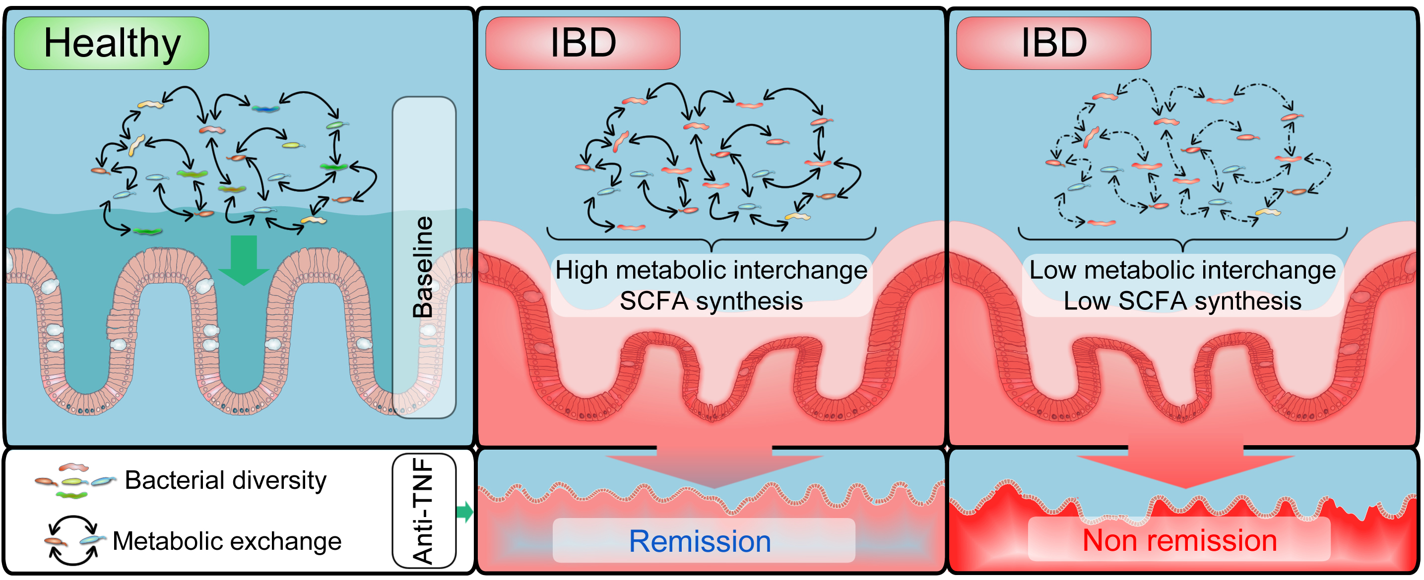 IBD patients for whom the symptoms disappear (go into remission) during treatment with the biologicals (Anti-TNF), already exhibit a different exchange of substances in their microbiome before treatment starts, compared with patients for whom the treatment does not work.
