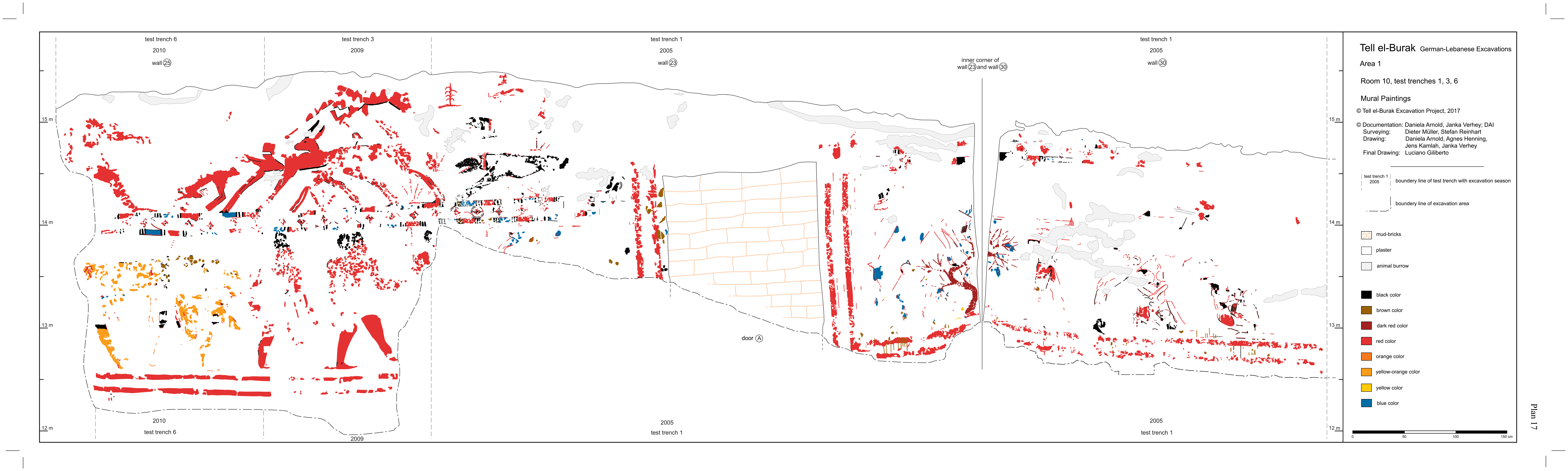 The paintings show a geometric frieze as well as a hunting scene, a procession, and a “tree of life.” Comparable motifs are known from the Ancient Near Eastern and Egyptian iconography, says Julia Bertsch from the University of Tübingen, a member of the team who has been investigating the paintings. She says the technique may be seen as a preliminary stage of the fresco because the preliminary drawings were applied to the still-damp plaster. By contrast, in the fully developed fresco technique, the paintings in their entirety are applied to the fresh plaster. As the plaster dries, the paints combine permanently with the substrate. "It was previously assumed that this technique was developed several centuries later in Minoan-Aegean palace paintings. These finds from Tell el-Burak show us that, at the very least, important steps in the development of the technique were made in the Near East,” says Bertsch.