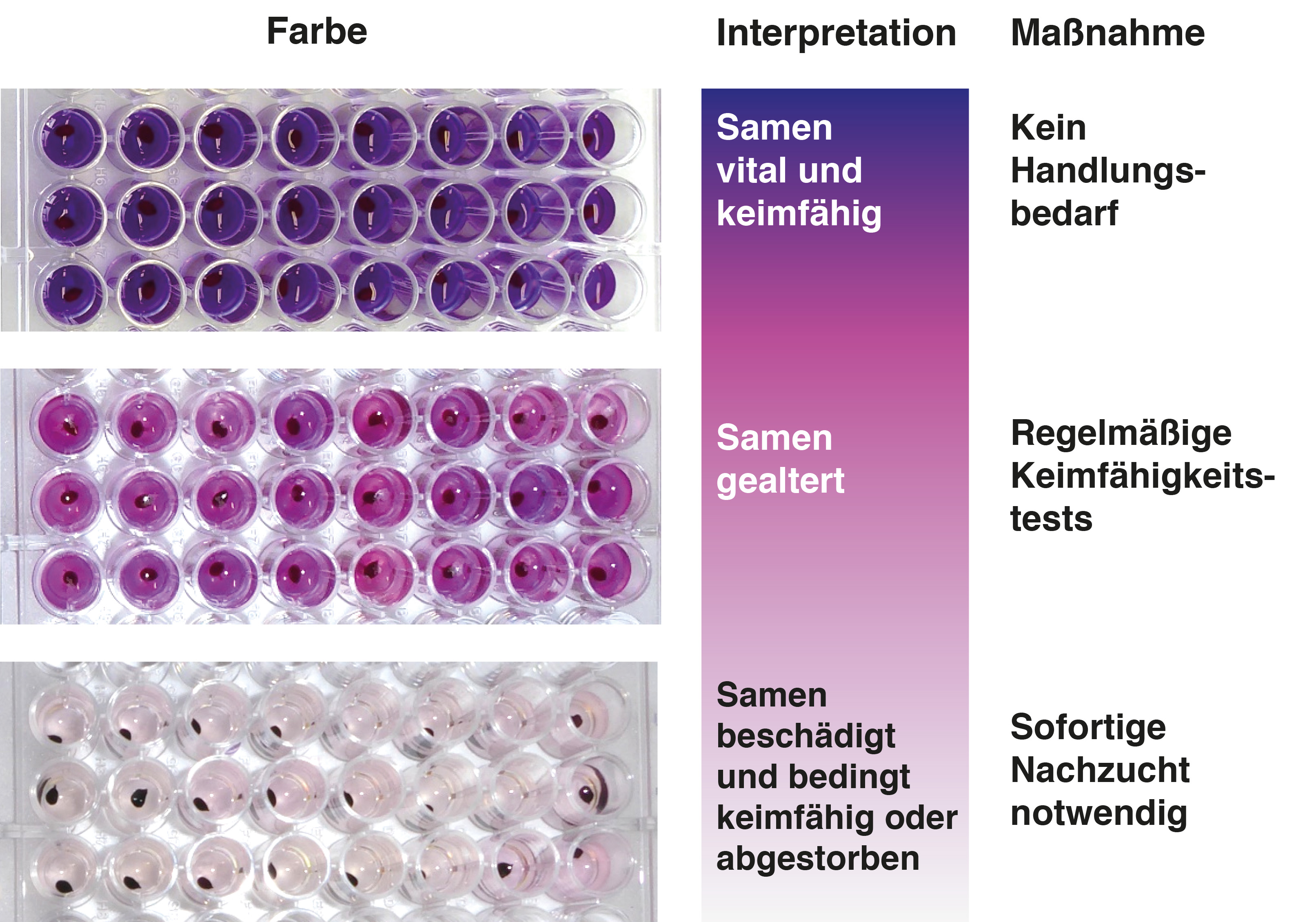 Eine blaue Testflüssigkeit zeigt voll vitale und keimfähige Samen an, eine pinkfarbene bereits gealterte Samen, während eine farblose Lösung beschädigte und nur bedingt keimfähige bis abgestorbene Samen anzeigt. „Der Farbumschlag beruht auf einer natürlichen Freisetzung von organischen Substanzen aus alternden Samen. Keimfähige Samen werden durch den Test nicht geschädigt und können später erneut getestet werden“, berichtet der Osnabrücker Biologe weiter.