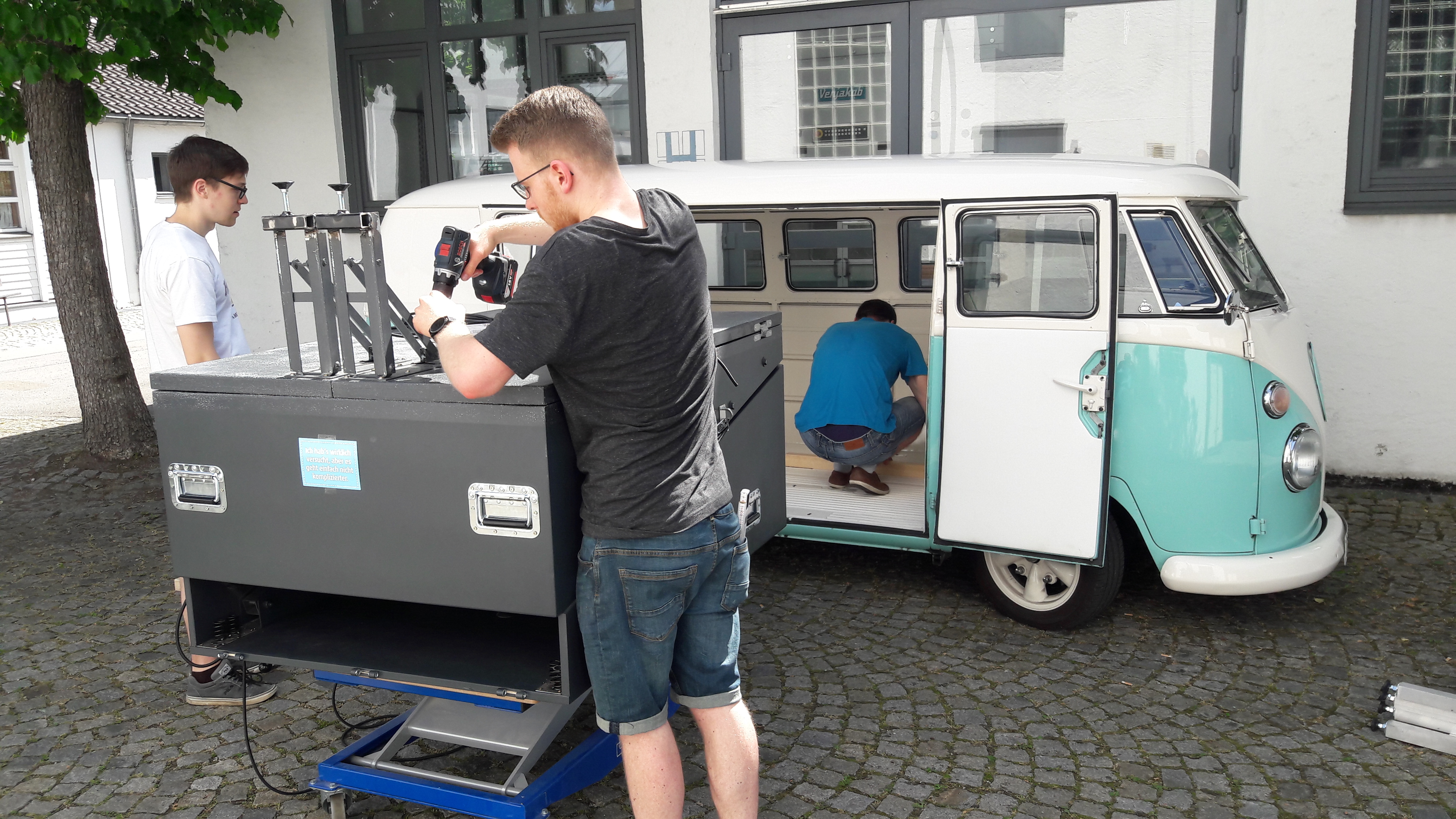 Die Aufgabe an die Studierenden: Sie sollten eine Konzertbühne entwickeln, die samt Lautsprecherboxen, Equipment, Instrumenten und zweiköpfiger Band in einen T1 Bulli aus dem Jahr 1967 passt. Alles sollte zudem so schnell wie möglich auf- und wieder abgebaut werden können. Der Kleinbus war schon zuvor gründlich renoviert und zu einem E-Auto mit 80 Kilowatt Leistung und einer Reichweite von 300 Kilometern umgerüstet worden – natürlich mit genug Power für den Betrieb der Soundanlage.