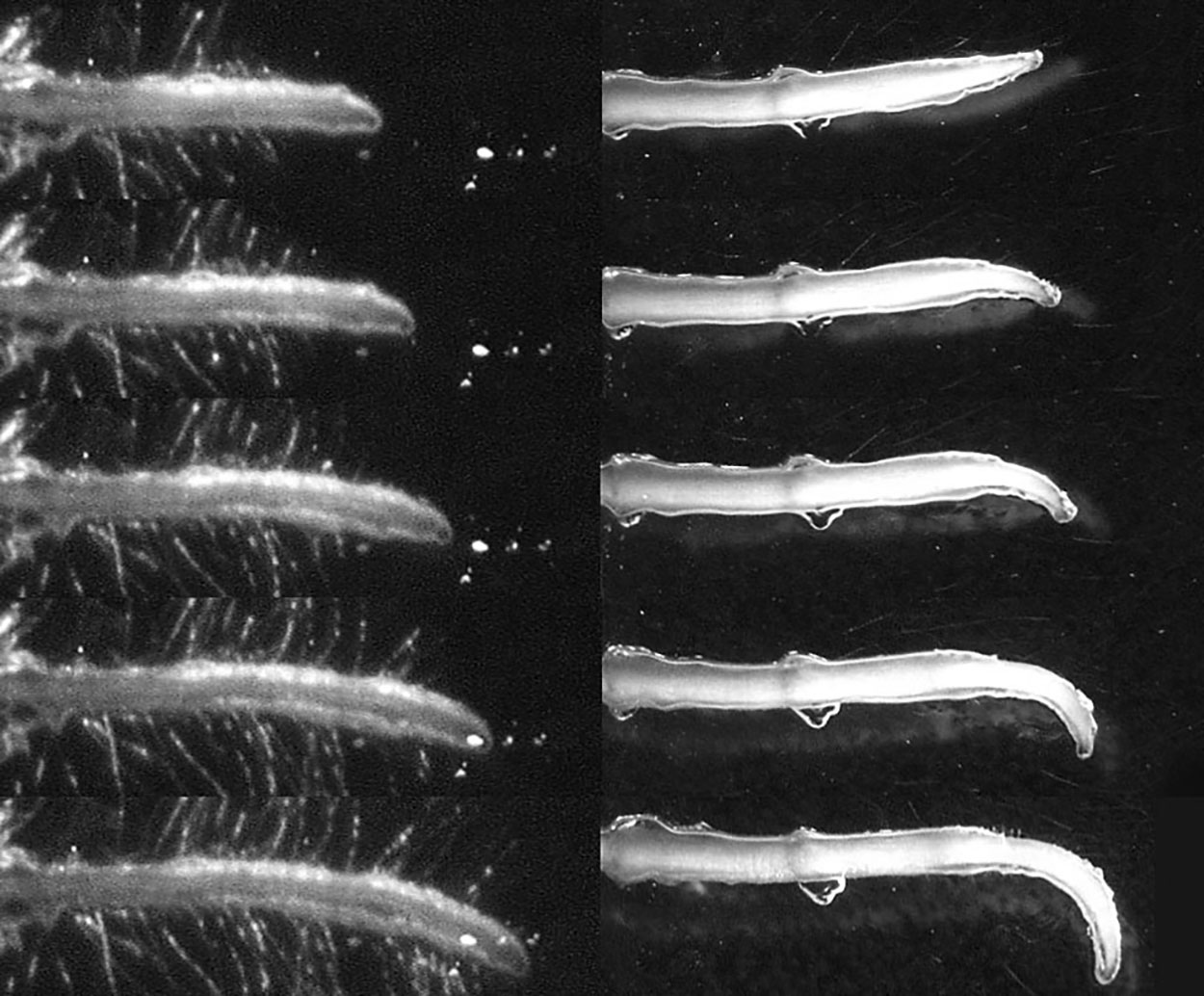 Nun gelang es Yuzhou Zhang, Postdoc in der Gruppe von Professor Jiří Friml, und seinem Team, erstmalig einen Einblick in die Entstehung des Wurzelgravitropismus zu erlangen. Dazu ließen die ForscherInnen die Wurzeln verschiedener Pflanzenarten unterschiedlichen evolutionären Alters – Moose, Bärlappgewächse, Farne, Nacktsamer und Blühpflanzen – in waagrechter Position wachsen und beobachteten dabei, ob und wann die Wurzeln begannen, sich nach unten zu biegen, um der Schwerkraft zu folgen. Das Ergebnis: Bereits in den primitivsten Landpflanzen, den Moosen, sowie den frühen Gefäßpflanzen, den Bärlappgewächsen und Farnen, fand von der Schwerkraft getriebenes Wurzelwachstum statt, allerdings nur in sehr rudimentärem Ausmaß und zudem sehr langsam. Erst Samenpflanzen (Nacktsamer und Blühpflanzen), die erstmalig vor rund 350 Millionen Jahren auftraten, zeigten ein schnelleres und damit viel effizienteres Wurzelwachstum in Richtung der Schwerkraft.
