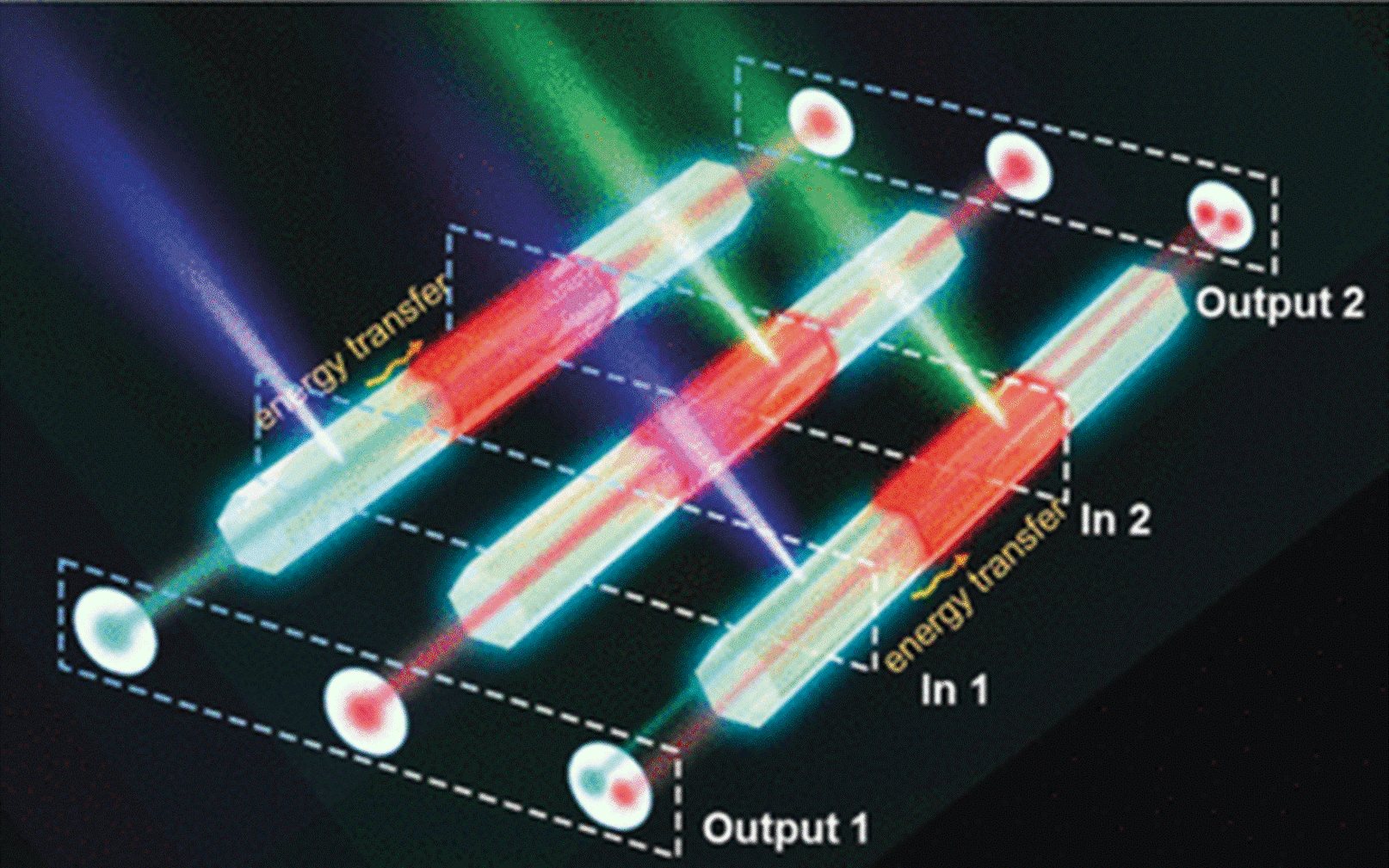 Auf dieser Basis eines solchen Stäbchens entwarfen die Forscher den Prototyp für eine logische Schaltung mit zwei „Eingängen“ und zwei „Ausgängen“, d.h. Stellen, an denen Licht eingespeist bzw. in Form roter und/oder blaugrüner Signale registriert werden kann. Die Forscher sehen potenzielle Anwendungen ihrer MOF-Kristalle in Bauteilen mit integrierten optischen Schaltkreisen, wie photonischen Dioden, On-chip-Signalverarbeitung und optischen Logikgattern.