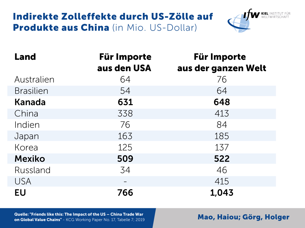 Die Zölle Chinas auf US-Produkte wirken sich vergleichsweise weniger über indirekte Zölle aus. So sind hier bei den weltweiten Importen am stärksten die USA selbst (325 Mio. US-Dollar) sowie die EU (126 Mio. US-Dollar) betroffen. Andere Länder haben indirekte Zolleffekte von unter 100 Mio. US-Dollar).
