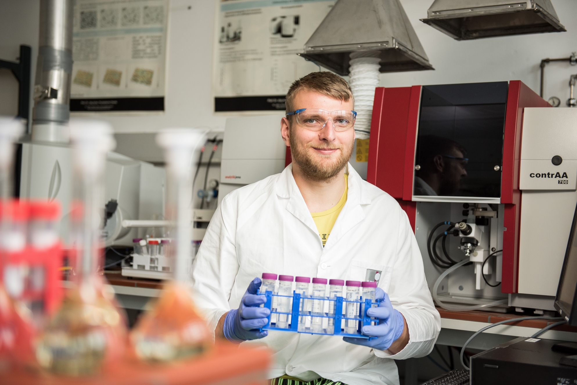 Mit der Pipette entnimmt Björn Fiebig einem Zentrifugenröhrchen die Probe einer durchsichtigen Lösung und gibt sie auf einen Graphitträger, der anschließend in einem Atomspektrometer positioniert wird. In dem Analysegerät wird die Probe auf über 2.000 Grad Celsius erhitzt und in ihre Atome zerlegt, um diese untersuchen zu können. Diese Arbeiten sind Bestandteil eines Projektes der Arbeitsgruppe Physikalische Chemie unter Leitung von Prof. Dr. Jörg Acker, in das sich der Student der Materialchemie an der BTU in Senftenberg engagiert einbringt.