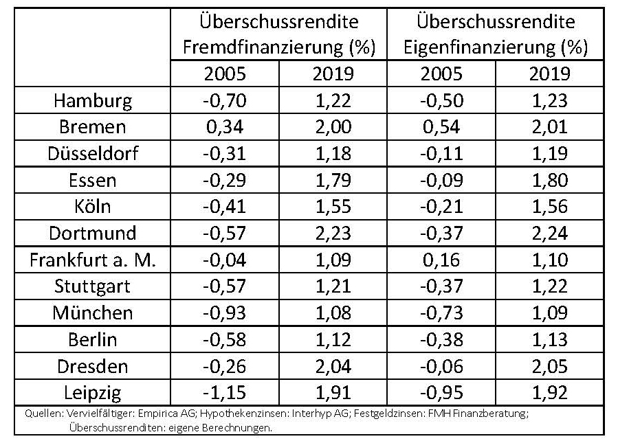 Schmidt hat errechnet, dass die Überschussrenditen in den betrachteten deutschen Großstädten im zweiten Quartal 2019 durchweg positiv und sogar höher als ein Prozent waren – sowohl bei Fremd- als auch bei Eigenfinanzierung. Im Vergleichsjahr 2005, als niemand von einer „Immobilienblase“ sprach, waren die Überschussrenditen dagegen fast durchweg negativ oder nahe null, das heißt, seinerzeit lagen die Immobilienpreise eher oberhalb ihres Fundamentalwertes und die Investoren spekulierten auf steigende Preise, Mieten und/oder Zinsen.