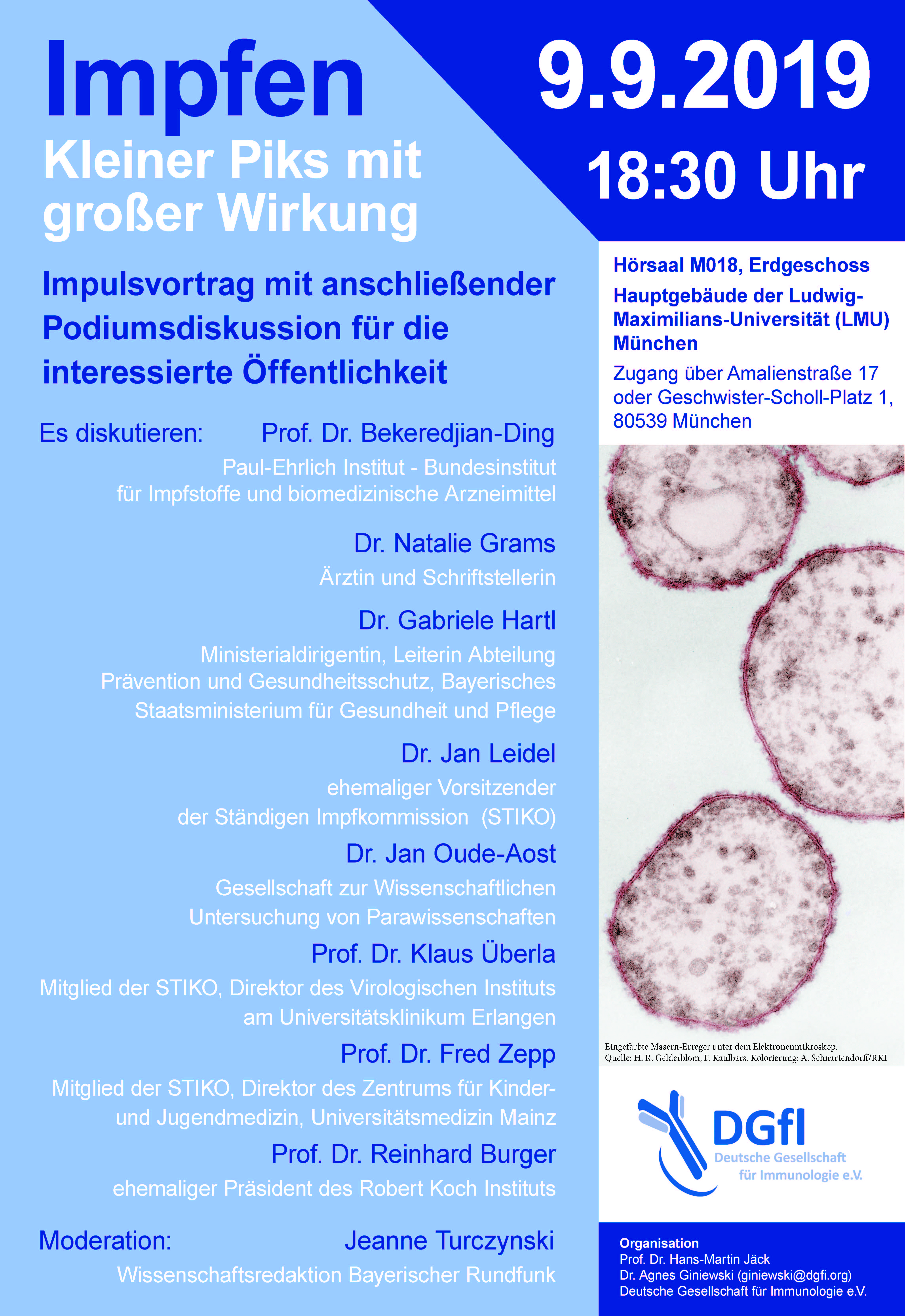 Zum Auftakt der 2. gemeinsamen Jahrestagung der Deutschen (DGfI) und Italienischen (SIICA) Gesellschaft für Immunologie laden wir die interessierte Öffentlichkeit am Abend des 9. September ab 18:30 Uhr zu der Podiumsdiskussion „Impfen – kleiner Piks mit großer Wirkung“ im Hauptgebäude der Ludwig-Maximilians-Universität München (Hörsaal M018; Zugang über Geschwister-Scholl-Platz 1 oder Amalienstraße 17, 80539 München) ein.