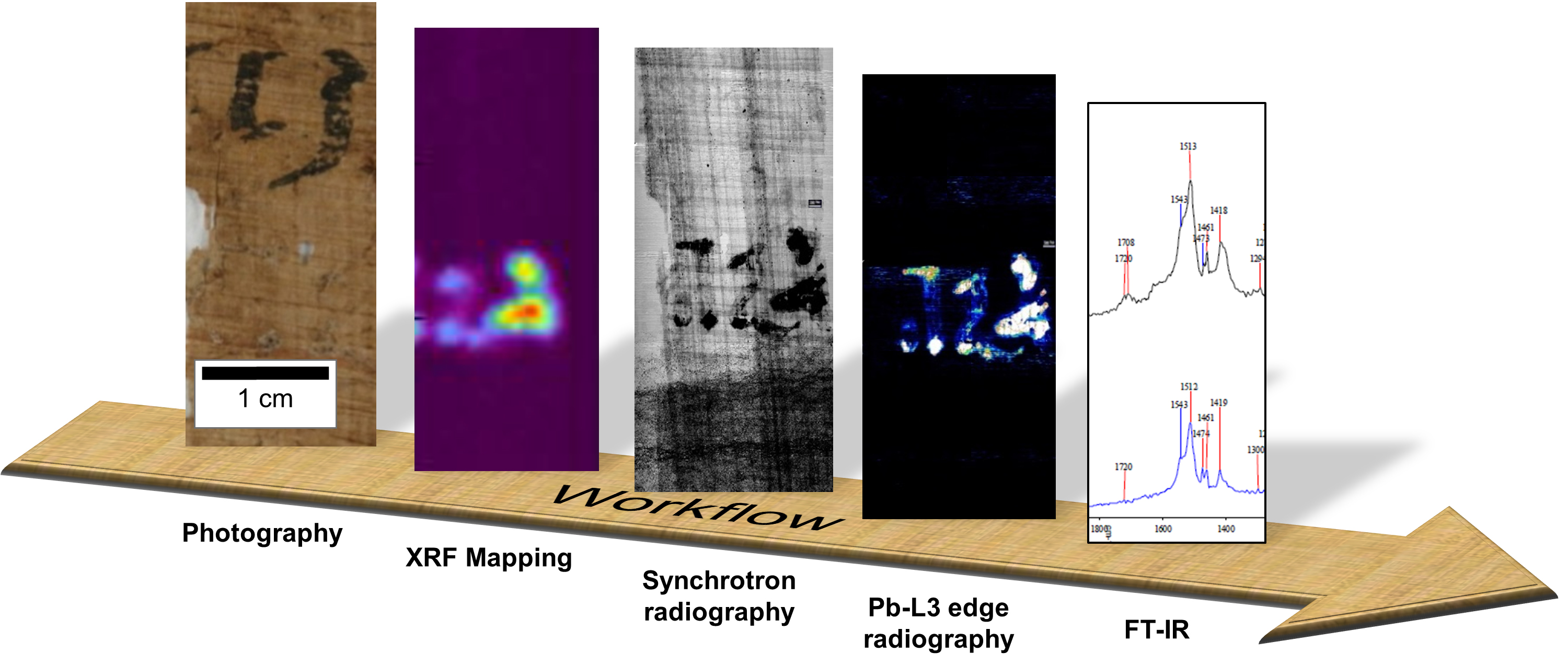 Allerdings sind die Zeichen nur unscharf zu erkennen. Viel schärfere Bilder liefert dagegen die Röntgen-Radiographie an BESSY II, weil die Synchrotron-Strahlung sehr viele Röntgen-Photonen mit hoher Kohärenz auf die Probe lenkt. Mit einer „Absorptionskanten-Radiographie“ an der BAMline von BESSY II kann die Brillanz dieser Methode für das untersuchte Element noch einmal verbessert und so die auf das Papyrus geschriebenen Zeichen besser vor der Struktur des alten Blattes erkannt werden. Zwar lässt sich dieses Zeichen derzeit noch nicht übersetzen, es könnte aber eine Gottheit symbolisieren.