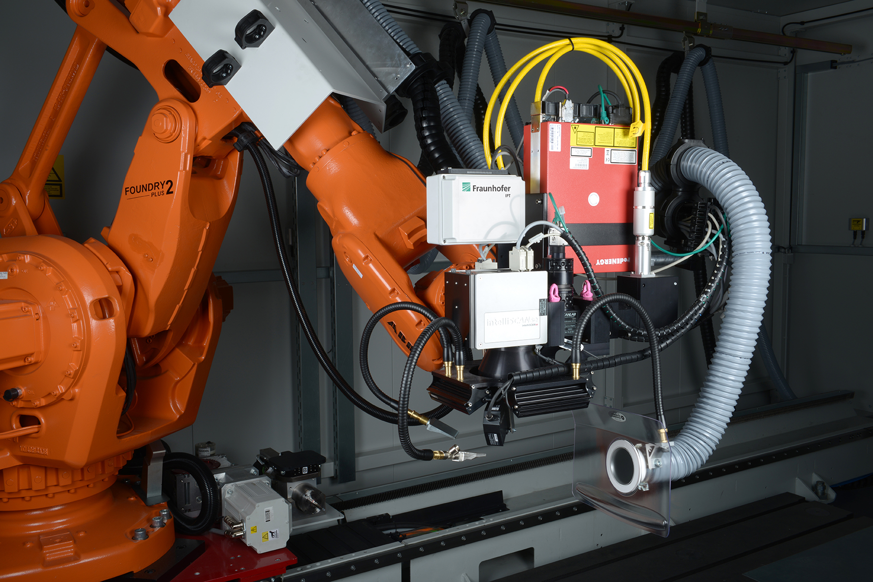Das neue System lässt sich in das eigens vom Fraunhofer IPT entwickelte »Multi-Technology Robot System for Adaptive Manufacturing MIRA« integrieren. MIRA bündelt mehrere Fertigungstechnologien wie das Bohren, Polieren oder Schleifen mittels einer Adapterplatte am Roboterkopf in einer einzigen lasergeschützten Roboterzelle. Dadurch lassen sich verschiedene Fertigungstechnologien in einem einzigen hybriden Fertigungssystem integrieren und so Rüst- und Nebenzeiten erheblich reduzieren. Neben den verschiedenen Fertigungstechnologien ist ein 3D-Digitalisierungssystem integriert, durch das sich die Qualität der einzelnen Fertigungsschritte ohne Umspannen überprüfen lässt. Der Industrieroboter ist auf einer Linearachse befestigt, wodurch sich die gesamte Aufspannfläche von 4 x 2,5 Meter ausnutzen lässt.