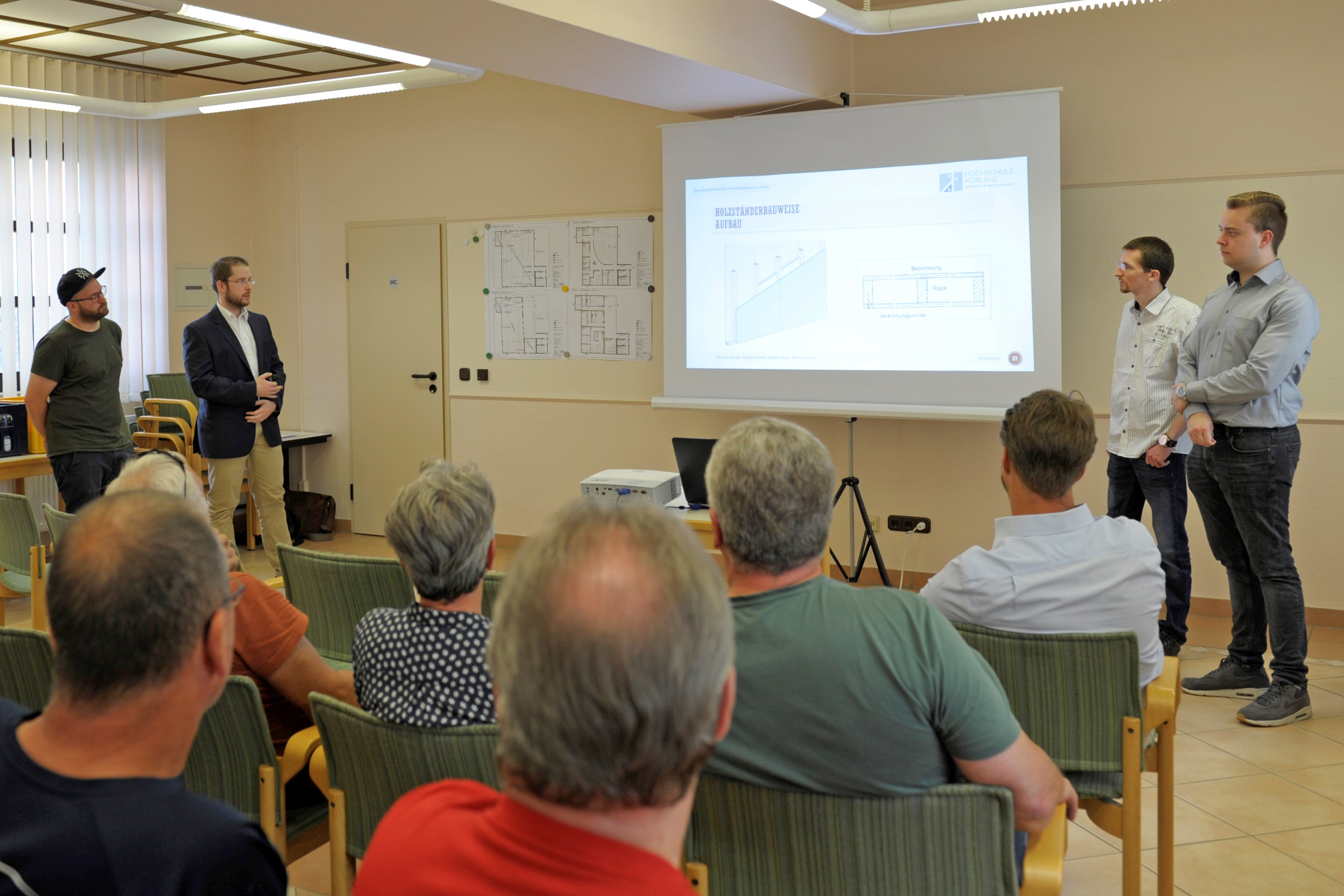 Der Neubau der zukünftigen Vereinsstätte soll die aktive kulturelle Vereinsarbeit innerhalb der Gemeinde mit barrierefreiem Wohnen verbinden und so ein Ort der Begegnung für alle Bewohner und Nutzer werden. Vier Studenten des Masterstudiengangs Bauingenieurwesen befassten sich im Rahmen einer Hausarbeit im Bereich Holzbau mit dieser interessanten Aufgabenstellung. „Es ging darum, das Gesamttragwerk der zukünftigen Vereinsstätte in einer nachhaltigen Holzbauweise auf dem Niveau einer Vorentwurfsplanung zu entwerfen“, erklärt Prof. Dipl.-Ing. Tim Göckel, Professor für Holzbau und Konstruktive Grundlagen an der Hochschule Koblenz. Die Masterstudenten hatten ihre Planungsergebnisse bereits im Juni bei einem Treffen am RheinMoselCampus in Koblenz erstmals Vertreterinnen und Vertretern der Gemeinde Urmitz und der Verbandsgemeinde Weißenthurm vorgestellt.