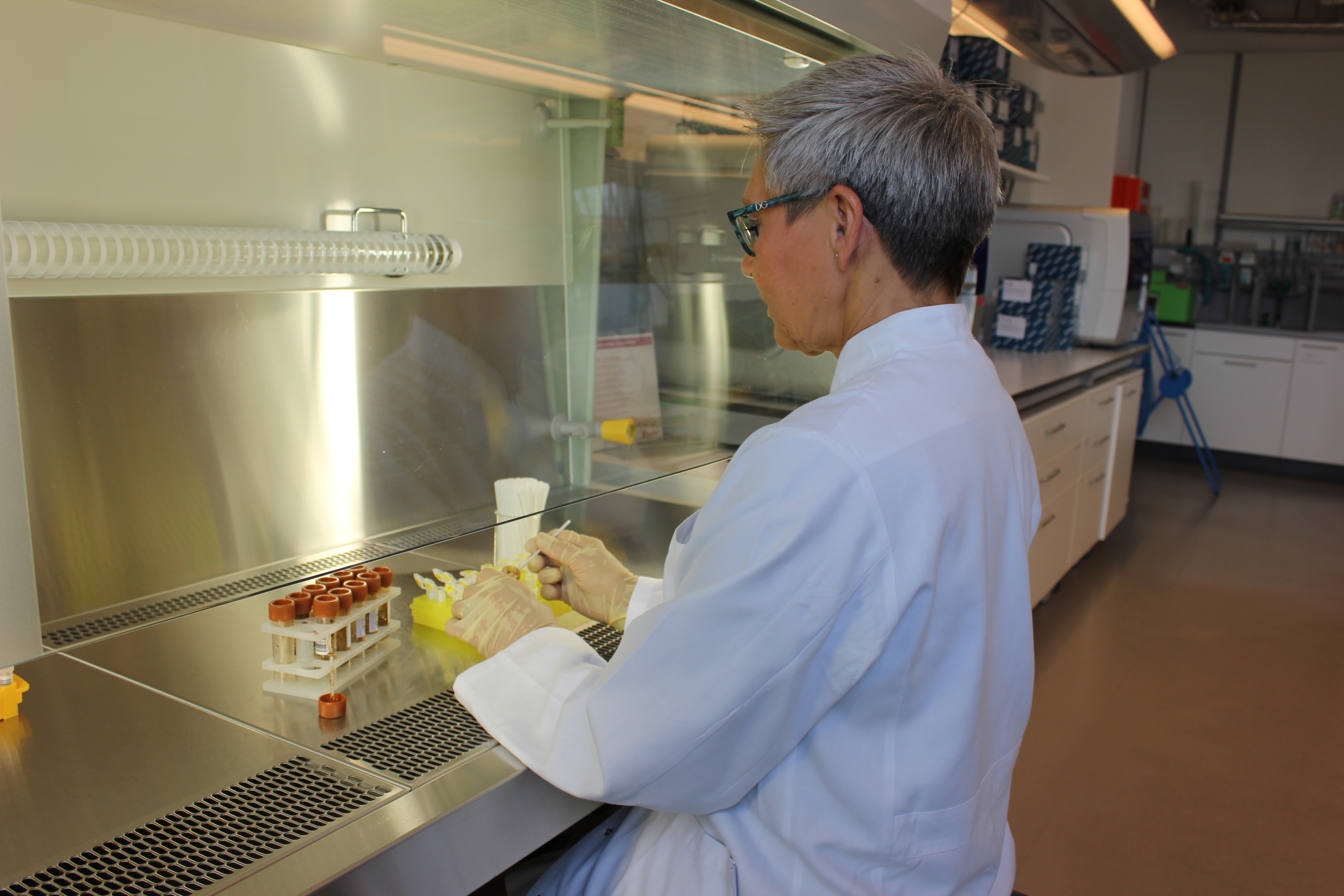 BU: Eine Mitarbeiterin am Institut für Klinische Molekularbiologie (IKMB) der Christian-Albrechts-Universität zu Kiel bereitet die Stuhlproben vor. Aus ihnen wird die DNA der Darmbakterien extrahiert, um die Zusammensetzung des Darmmikrobioms zu bestimmen.