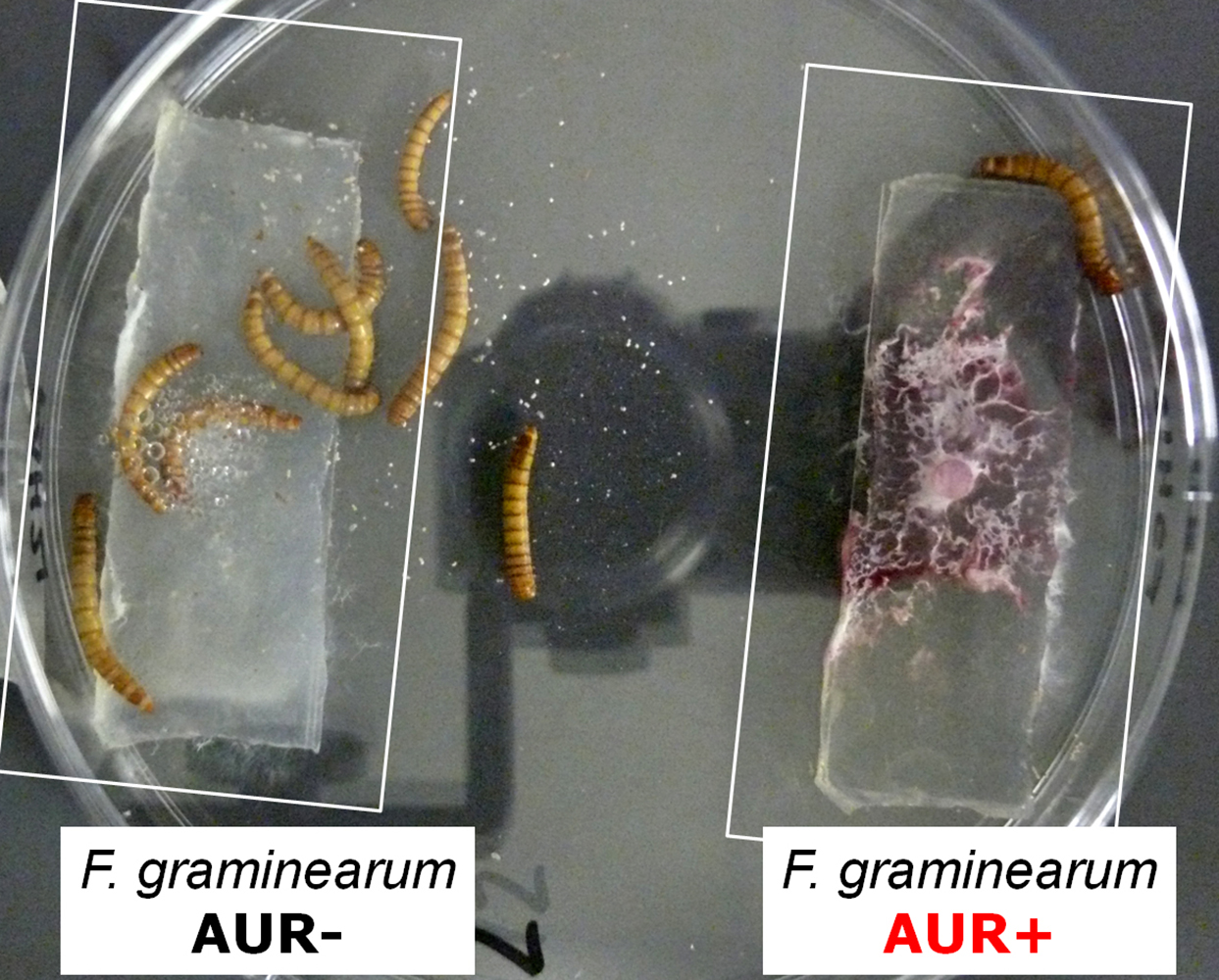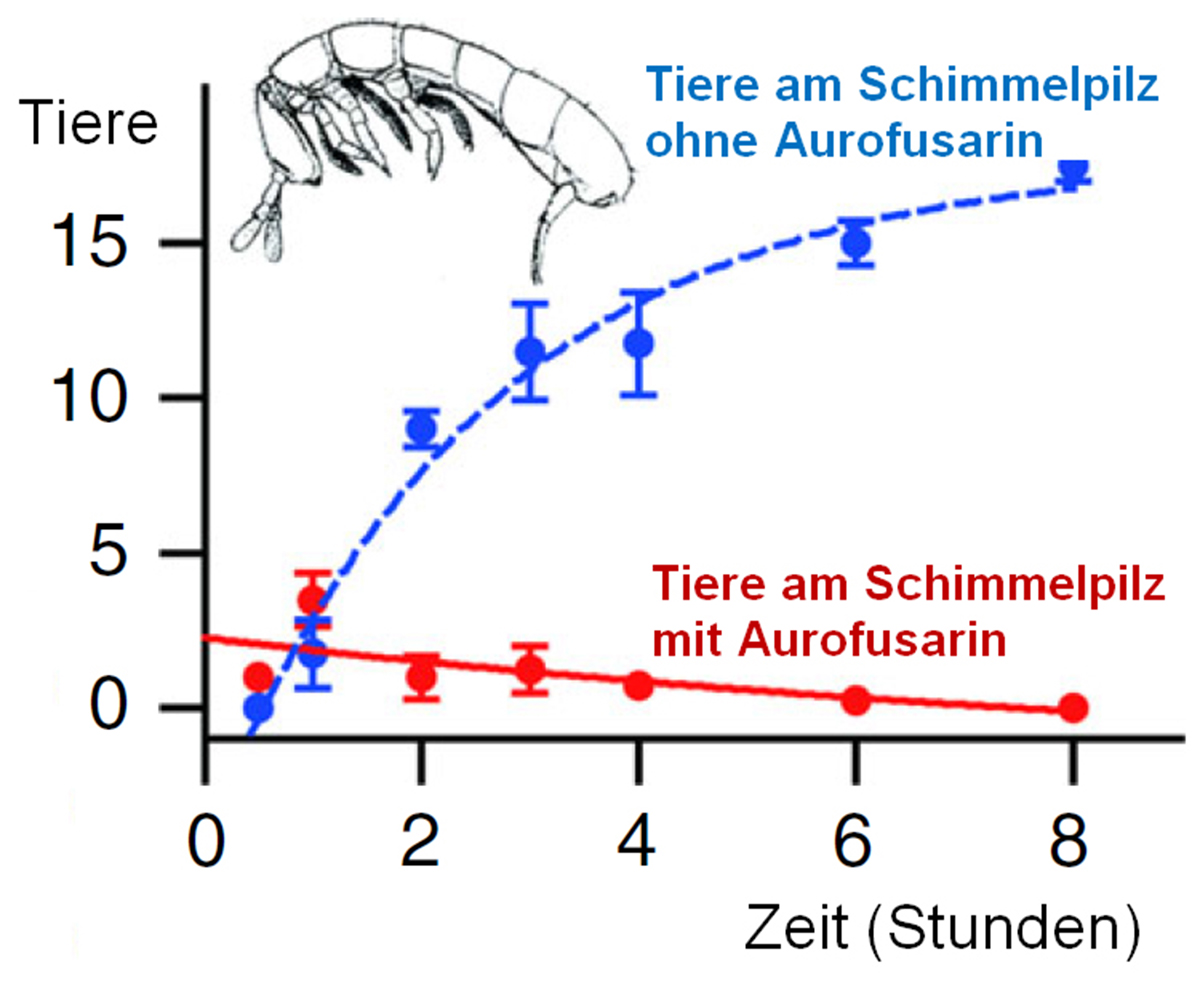 Die Göttinger Wissenschaftlerinnen und Wissenschaftler fanden nun heraus, dass nicht Mykotoxine, sondern bestimmte Pigmente die Pilze vor Prädatoren schützen. Diese Pigmente, die von vielen Schlauchpilzen gebildet werden, gehören der Stoffklasse der Bis-naphthopyrone an. Als Modellsubstanz diente in Göttingen das tiefrote Pigment Aurofusarin, das von den Arten der Pilzgattung Fusarium und von tropischen Schimmelpilzen produziert wird: Springschwänze und Insektenlarven erkannten das Aurofusarin in Fütterungsversuchen und mieden es. Den entscheidenden Beweis für die ökologische Funktion lieferten Pilzmutanten, in denen die Forscherinnen und Forscher die Bildung des Pigments unterbanden. Diese wurden von Springschwänzen, Asseln und Insektenlarven als Nahrung akzeptiert, während Pilzkolonien mit Aurofusarin gemieden wurden. Fütterungsversuche mit verschiedenen Fusariumarten und Mutanten zeigten außerdem, dass das Aurofusarin bei dieser Pilzart der wichtigste oder sogar einzige Abwehrstoff ist. Darüber hinaus ergaben erste Versuche mit anderen Bis-naphthopyronen, die von den Pilzgattungen Penicillium und Aspergillus gebildet werden, dass auch diese fraßhemmend wirken.